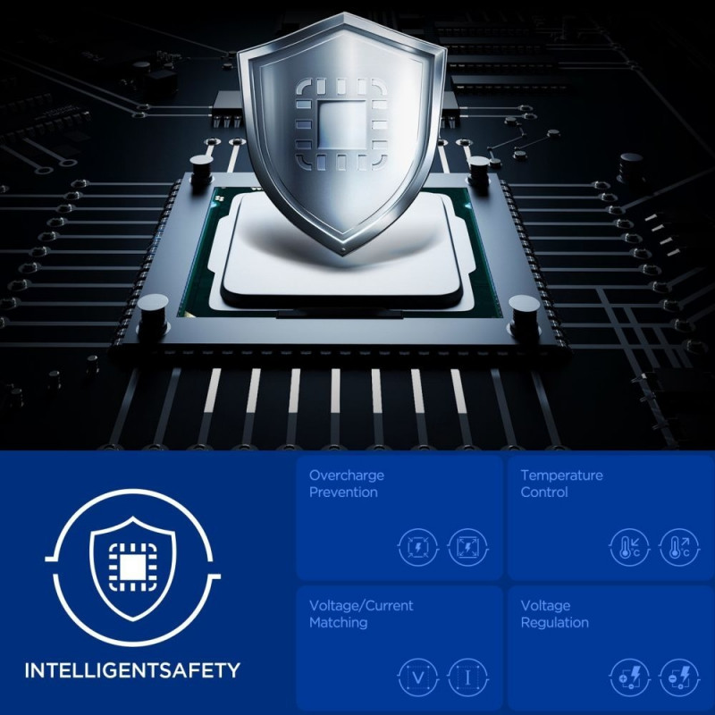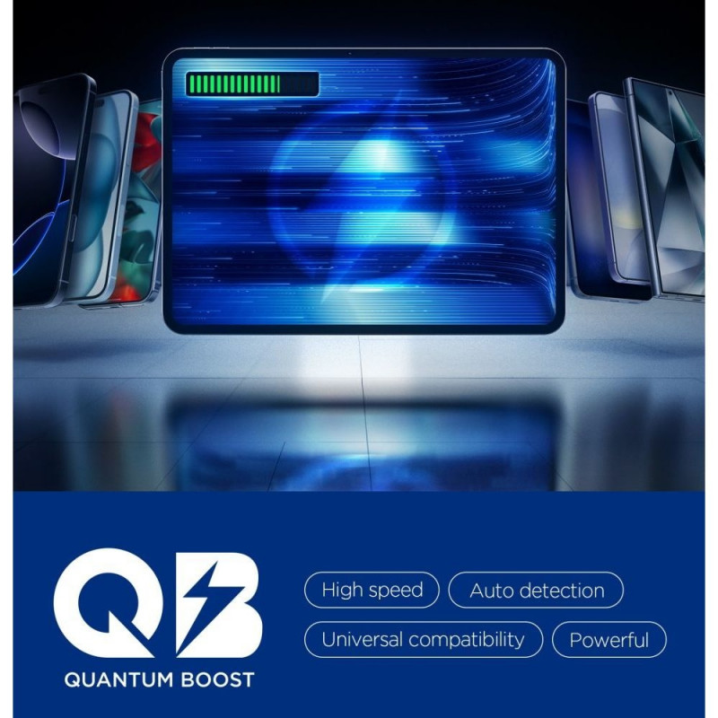 Quantum Boost tehnoloogia kohandab automaatselt laadimisvõimsust vastavalt ühendatud seadmele, maksimeerides selle tõhusust. Sisseehitatud Overcharge Prevention, Voltage Matching ja Voltage Regulation funktsioonid kaitsevad seadmeid ülelaadimise, liigpinge ja ebastabiilse voolu eest, tagades turvalise ja stabiilse laadimise igas olukorras.
