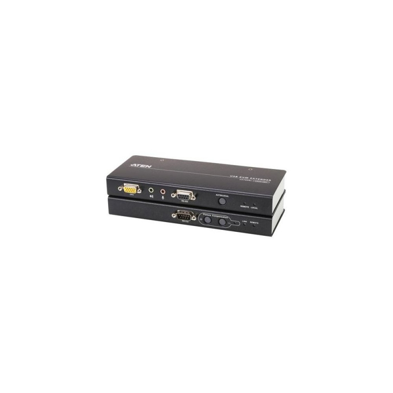 The CE750A is a USB-based KVM Extender with automatic signal compensation and RS-232 serial functionality that allows access to a computer system from a remote USB console (USB keyboard, monitor, and USB mouse).<br><br>Because it allows access to a computer system from a remote console, the CE750A is perfect for use in any type of installation where you need to place the console where it is conveniently accessible, but you want the system equipment to reside in a safe location – for example away from the dust and dirt of the factory floor or the harsh environment of a construction site.<br><br> The CE750A improves on previous designs by the addition of an RS-232 port, on both the Local and Remote Units, that allows you to connect to a serial terminal for configuration (Local Unit) or serial devices such as touchscreens and barcode scanners (Remote Unit).ATEN USB VGA KVM Extender with Audio and RS-232 (200m). Type: Transmitter & receiver, Connectivity technology: Wired, Maximum transfer distance: 200 m. Transmitter local video port type: VGA, Transmitter local keyboard/mouse port type: USB. Receiver local video port type: VGA, Receiver local keyboard/mouse port type: USB. Transmitter width: 8.63 cm, Transmitter depth: 20.2 cm, Transmitter height: 2.5 cm