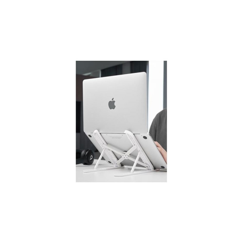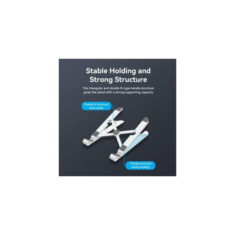 <b>Ergonomic View Improvement</b><br>Lifts view and relaxes the cervical spine.<br><br><b>9 Gear Adjustment</b><br>Adjust to your cozy view with a more comfortable studying and officing experience.<br><br><b>Stable Holding and Strong Structure</b><br>The triangular and double N-type tensile structure gives the stand with a strong supporting capacity.<br><br><b>Anti-slip Silicone</b><br>Triple silicone anti-slip pad to prevent laptop from scratching.<br><br><b>High Efficient Heat Dissipation</b><br>Open space bottom design to increase the air flow and significantly lower down the core temperature of laptop.<br><br><b>Portable Sizefor Travelling</b><br>Foldable stand to be carried with ultra light weight.<br><br><b><17.3" Size Applicable</b><br>Universally compatible to tablet/laptop with size smaller than 17.3".Vention Laptop Stand White. Product type: Laptop stand, Product colour: White, Material: ABS synthetics, Silicone. Height adjustment range: 83 - 170 mm. Width: 172.3 mm, Height: 170 mm, Length: 246 mm. Package type: Box
