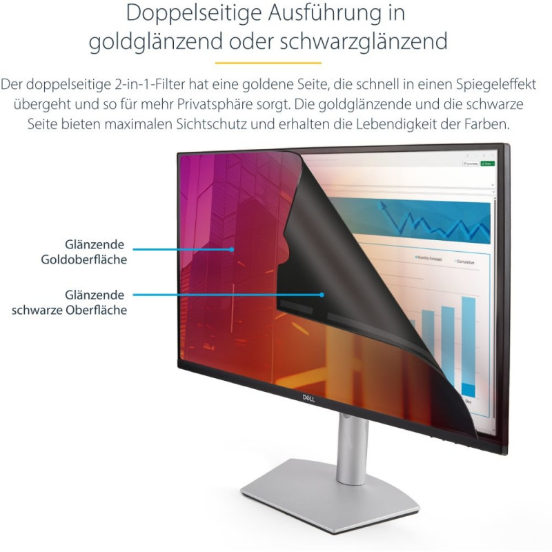 StarTech.com 24-tolline 16:9 monitori kuldne privaatsusfilter, kahepoolne privaatsusfilter suurendatud privaatsusega, läikiv ekraanikaitsekile, eemaldatav sinise valguse filter ±30° vaatenurgaga. Maksimaalne ekraanisuurus: 61 cm (24"). Kuvasuhe: 16:9. Sobib: monitorile, tüüp: raamita privaatsusfilter. Pinnaviimistlus: läikiv, valguse läbilaskvus: 60%, piirab vaatenurka: 30°. Kaal: 100 g
