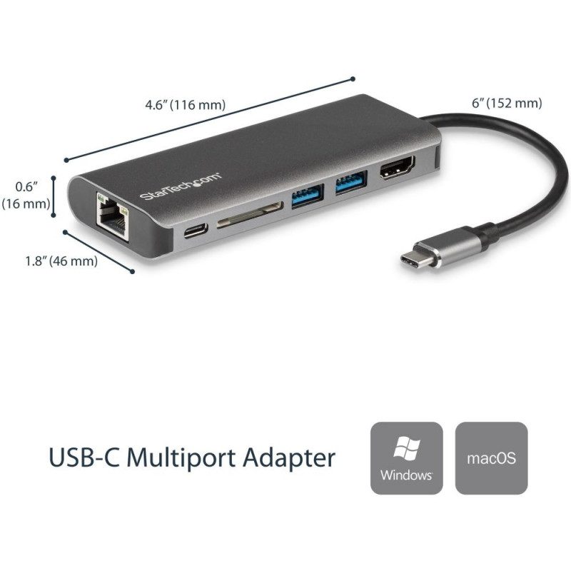 StarTech.com USB-C mitmeotstarbeline adapter, kaasaskantav USB-C dokk 4K HDMI-ga, 2-pordiline USB 3.0 jaotur, SD/SDHC, GbE, 60 W PD läbipääs – USB Type-C/Thunderbolt 3 – ASENDATUD TOOTEGA DKT30CHSDPD1. Ülekandetehnoloogia: juhtmega, hostiliides: USB 3.2 Gen 1 (3.1 Gen 1) Type-C. Etherneti LAN andmeedastuskiirused: 10, 100, 1000 Mbit/s, võrgustandardid: IEEE 802.3, IEEE 802.3ab, IEEE 802.3u. Toote värv: must, hall, ühilduvad mälukaardid: MMC, SD, andmeedastuskiirus: 5 Gbit/s. Toiteallikas: USB, toitevõimsus: 60 W. Toetatud Windowsi operatsioonisüsteemid: Windows 10, Windows 10 Education, Windows 10 Education x64, Windows 10 Enterprise, Windows 10... Toetatud Maci operatsioonisüsteemid: Mac OS X 10.11 El Capitan, Mac OS X 10.12 Sierra, Mac OS X 10.13 High Sierra, Mac OS X 10.14... Muude operatsioonisüsteemide tugi: ChromeOS