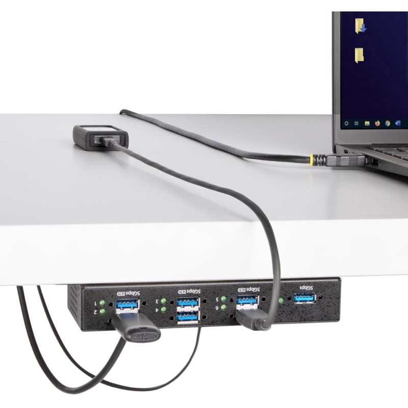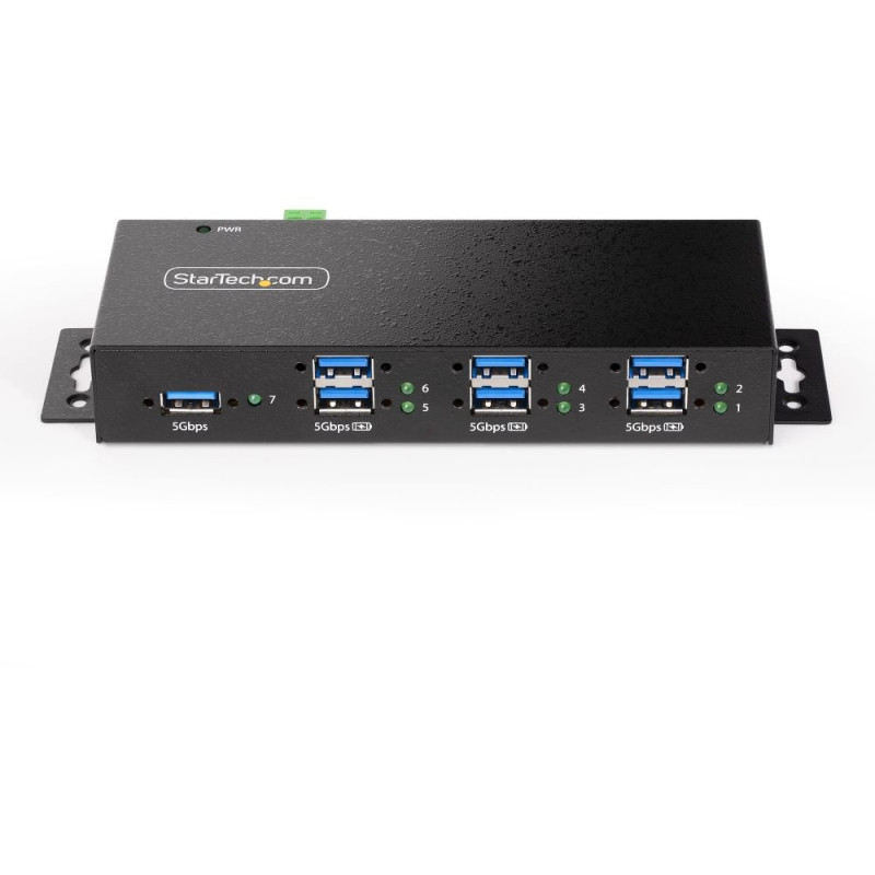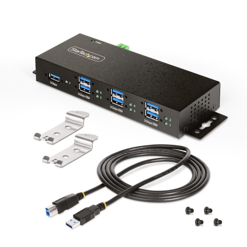 StarTech.com 7-pordiline USB 3.0 jaotur tugeva metallist tööstusliku korpusega, hallatav, ESD- ja ülepinge kaitsega, seina-/laua-/DIN-liistule paigaldatav, USB 3.1/3.2 Gen 1 5Gbps, USB jagaja/splitter. Host-liides: USB 3.2 Gen 1 (3.1 Gen 1) Type-B, jaoturi liidesed: USB 3.2 Gen 1 (3.1 Gen 1) Type-A. Andmeedastuskiirus: 5000 Mbit/s, toote värvus: must, korpuse materjal: metall. Laius: 114 mm, sügavus: 67 mm, kõrgus: 26 mm. Pakendi laius: 213 mm, pakendi sügavus: 149 mm, pakendi kõrgus: 51 mm. Komplektis olevad kaablid: USB Type-A USB Type-B-le.