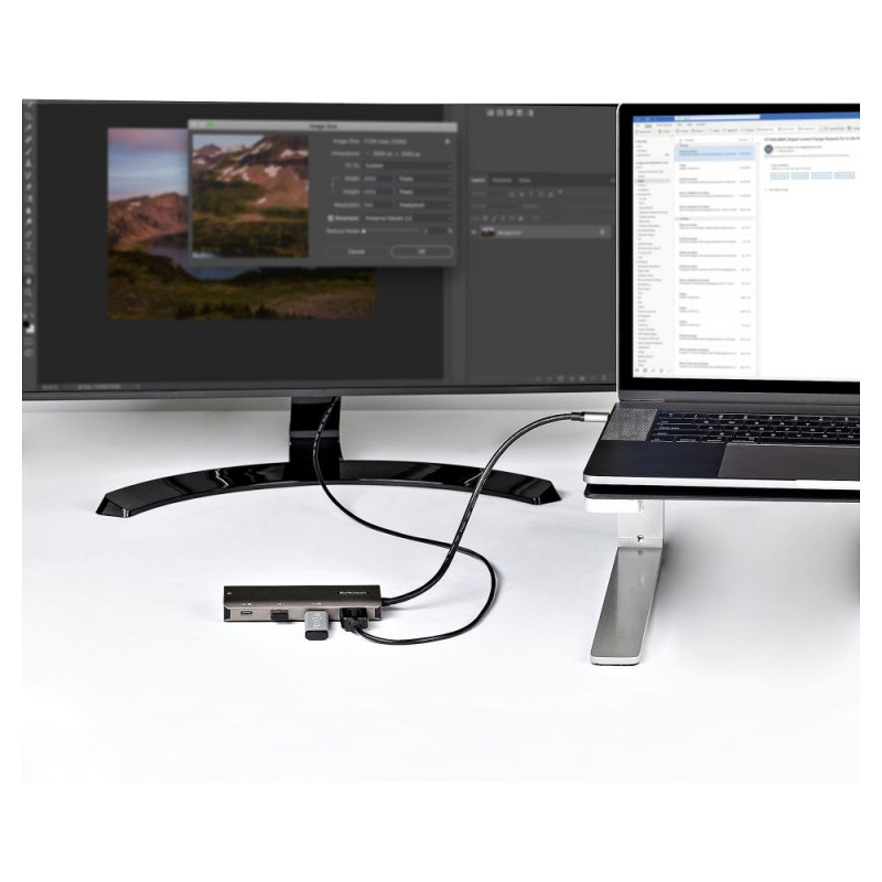 StarTech.com USB C Multiport Adapter - 10 Gbit/s USB Typ C Mini Dock koos 4K 30Hz HDMI - Power Delivery 3.0 Passthrough - 3 Port USB Hub, GbE - USB 3.1 / 3.2 Gen 2 Laptop Dock - 25 cm kaabel. Ühenduvustehnoloogia: Juhtmega ühendatud, Host-liides: USB 3.2 Gen 2 (3.1 Gen 2) Type-C, USB-toide kuni: 100 W. Ethernet LAN andmeedastuskiirused: 100,1000 Mbit/s. Toote värv: Must, Hall, Andmeedastuskiirus: 10 Gbit/s, Resolutsioon (maksimaalne, digitaalne): 3840 x 2160 pikslit. Toetatud Windowsi operatsioonisüsteemid: Windows 10, Windows 10 Education, Windows 10 Education x64, Windows 10 Enterprise, Windows 10..., Toetatud Maci operatsioonisüsteemid: Mac OS X 10.12 Sierra, Mac OS X 10.13 High Sierra, Mac OS X 10.14 Mojave, Mac OS X 10.15 Catalina,..., Toetatud serveri operatsioonisüsteemid: Windows Server 2008 R2, Windows Server 2016. Laius: 46 mm, Sügavus: 117 mm, Kõrgus: 16 mm
