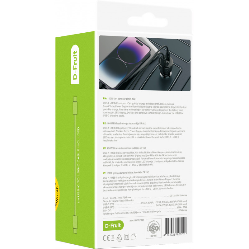 D-Fruit autolaadija 100W USB-C + kaabel DF152