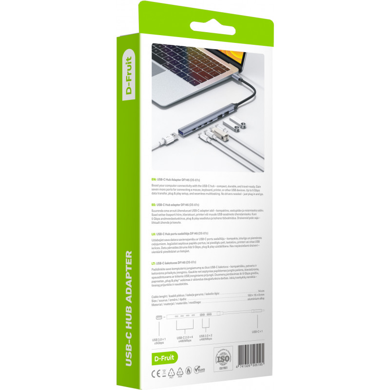 Hubil on neli USB-C 2.0 pesa, kaks USB-A 2.0 ja üks USB-A 3.0 pesa, mis tagavad andmeedastuskiiruse kuni 5 Gb/s – failide kopeerimine, väliste kõvaketaste või mälupulkade kasutamine, hiire, klaviatuuri ja muude USB-seadmete ühendamine käib kiirelt ja tõrgeteta.