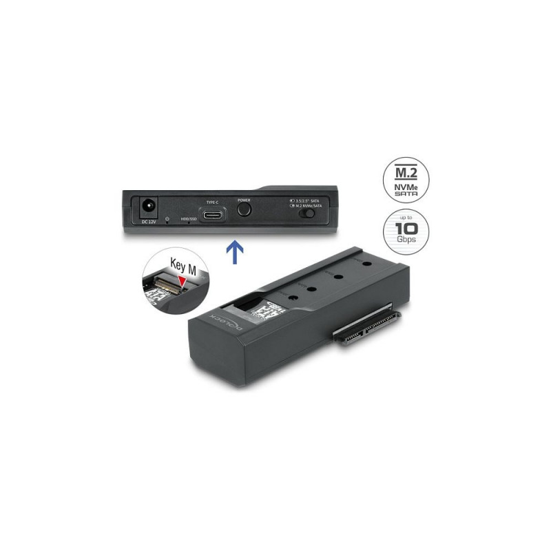 DeLOCK USB Type-C konverter 1 x M.2 SSD või 1 x SATA SSD / HDD jaoks. Andmekandja tüüp: HDD, SSD, andmeketta liides: M.2, Serial ATA III, toetatud andmeketta suurused: 2,5; 3,5; M.2. Host-liides: USB 3.2 Gen 2 (3.1 Gen 2) Type-C. Toote värvus: must, materjal: plast, maksimaalne andmeedastuskiirus: 6 Gbit/s. Vahelduvvoolu sisendpinge: 100–240 V, vahelduvvoolu sisendsagedus: 50–60 Hz, sisendvool: 1,5 A. Laius: 35 mm, sügavus: 107 mm, kõrgus: 24 mm