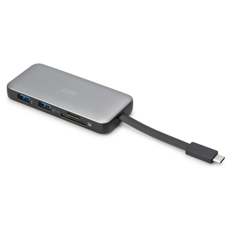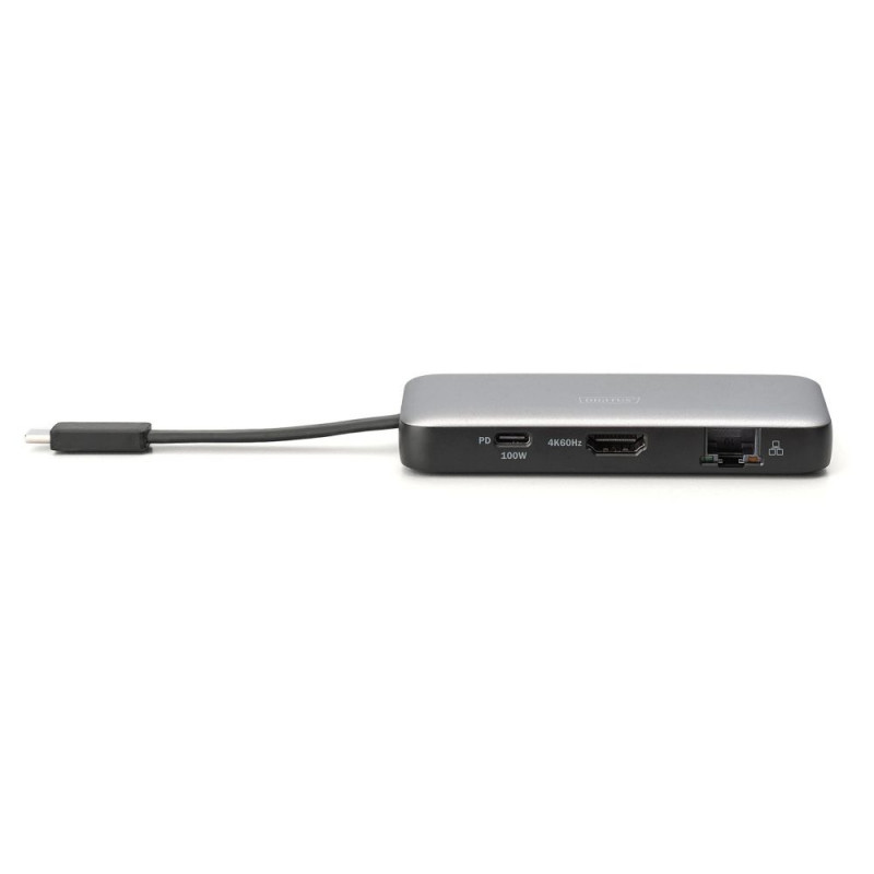 Digitus USB-C Travel Docking Station, 7-porti. Ühenduvustehnoloogia: Juhtmega ühendatud, Host-liides: USB 3.2 Gen 2 (3.1 Gen 2) Type-C, USB-toide kuni: 100 W. Ethernet LAN andmeedastuskiirused: 10,100,1000 Mbit/s. Toote värv: Must, hall, Ühilduvad mälukaardid: MicroSD (TransFlash), SD, Andmeedastuskiirus: 10 Gbit/s. Toiteallikas: USB, Toitepistik: USB Typ-C, USB-kaabli pikkus: 0,1 m. Toetatud mobiilsed operatsioonisüsteemid: Android, iOS, Muude operatsioonisüsteemide tugi: ChromeOS