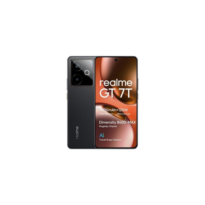 <br />realme GT 7T. Display diagonal: 17.3 cm (6.8"), Display resolution: 2800 x 1280 pixels. Processor family: MediaTek Dimensity, Processor model: Dimensity 8400 Max. RAM capacity: 12 GB, Internal storage capacity: 512 GB. Rear camera resolution (numeric): 50 MP, Rear camera type: Dual camera. SIM card capability: Dual SIM. Operating system installed: Android 15. Battery capacity: 7000 mAh. Product colour: Black