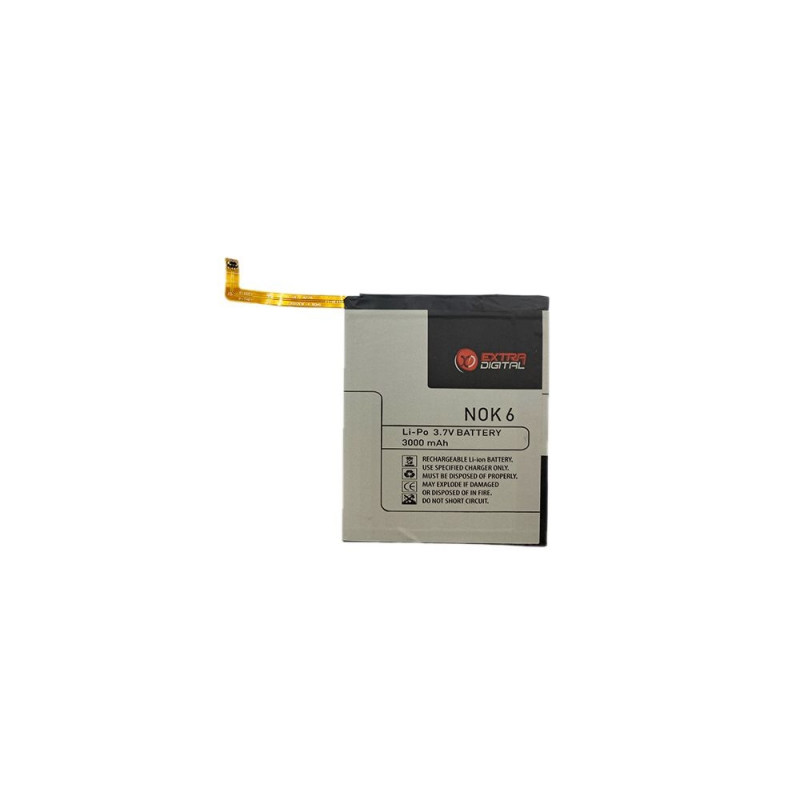 Load faster - use longer - feel safer! High quality Extra Digital lithium ion batteries with shorter charging time and longer battery life. Battery replaces the original: Nokia 6 Technical specification:Capacity: 3000 mAhType: Li-polymerVoltage: 3.7 VNote: The list of compatible batteries and phones may be incomplete.Warranty: 12 months.Manufacturer: Extra Digital, EU
