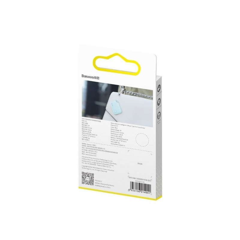 Producent Baseus Name Intelligent T2 rope type anti-loss device Product code ZLFDQT2-03 Material PC Color Blue Power supply Battery button 3V, 75 mAh (changeable) Battery lifespan around 6 months Loudness 80-100 dB Dimensions 37 x 25 x 6 mm Weight 5 g Number of locators supported simultaneously Android: max. 4, iOS; max. 6