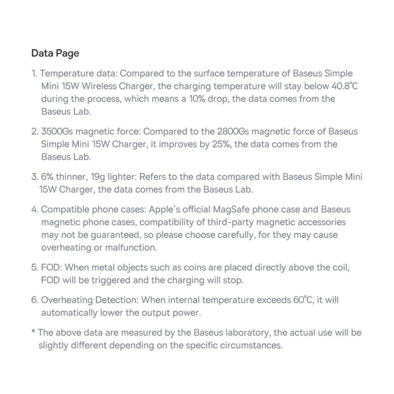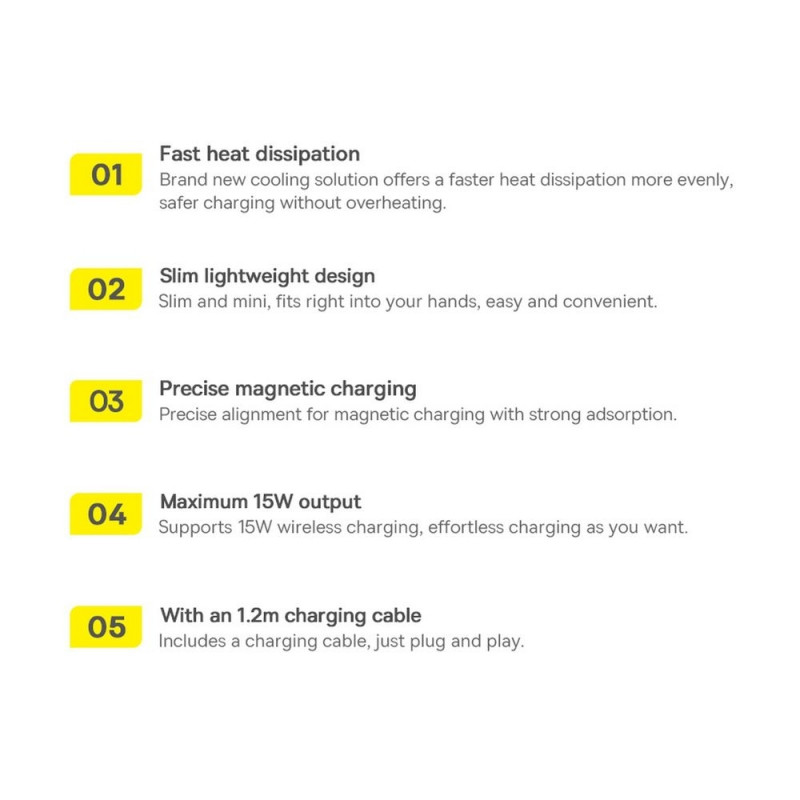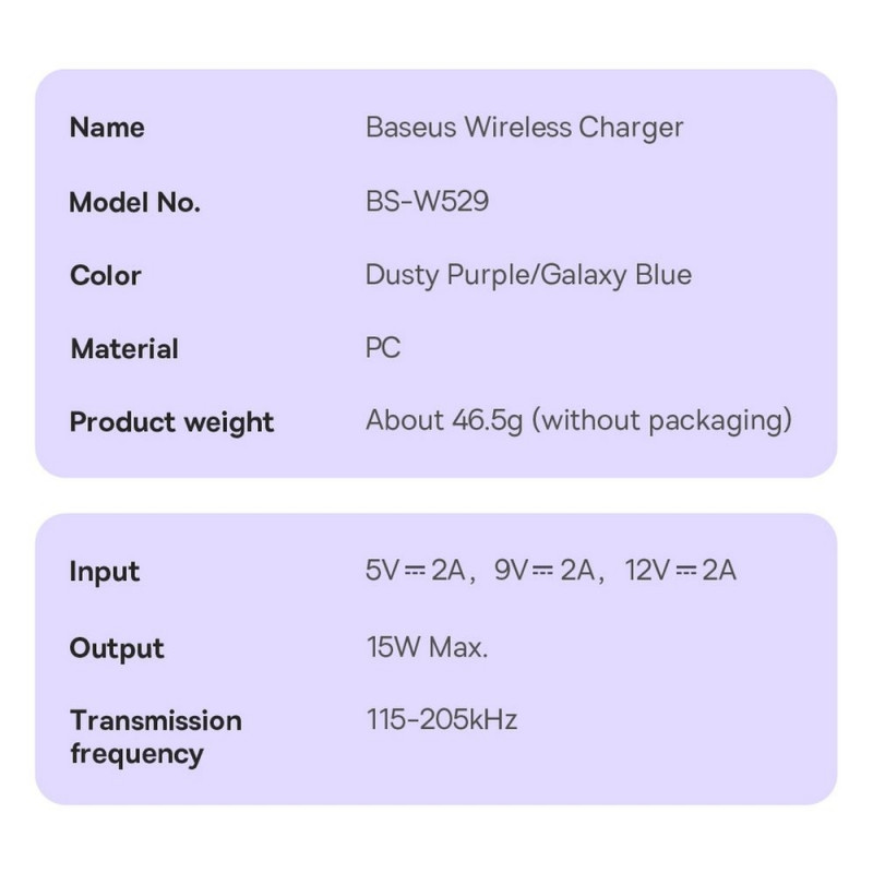 Baseus laadijal on väga head omadused ja see toetab kõige populaarsemaid telefonimudeleid, mis on varustatud traadita laadimisfunktsiooniga Qi, MagSafe. Seade on valmistatud PC materjalist ja sellel on kaitse seadme kahjustuste või ülekuumenemise eest. See on ideaalne sagedaseks kasutamiseks ja selle disain sobib hästi kaasaegsete kodude või kontorite interjööri.