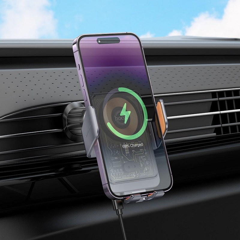 Hoco autovahend koos juhtmevaba laadimisega. Paigaldatakse õhuvõlli. See võimaldab teil ohutult kasutada oma nutitelefoni sõites.