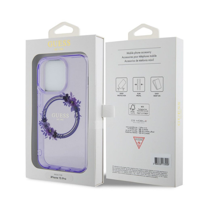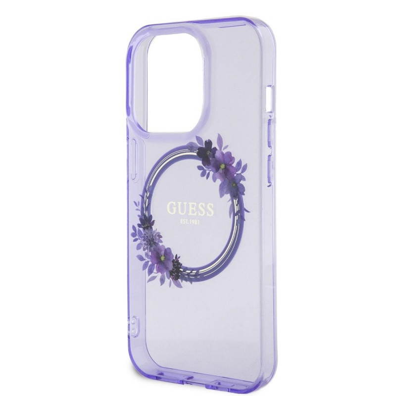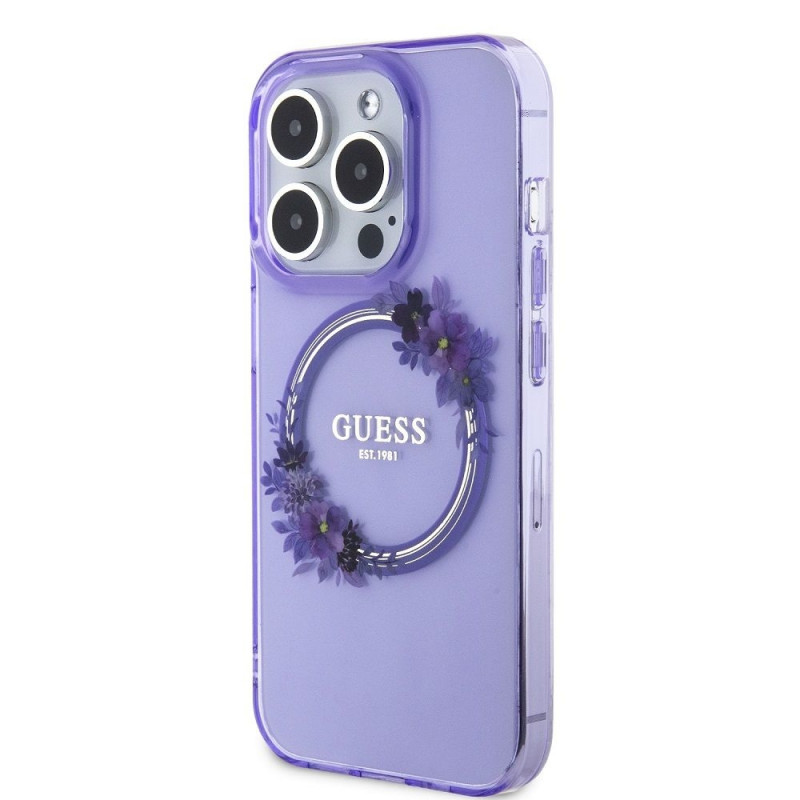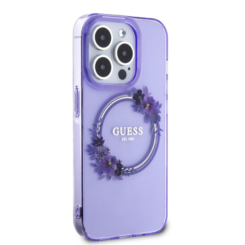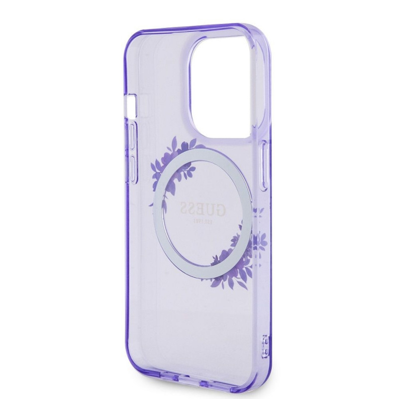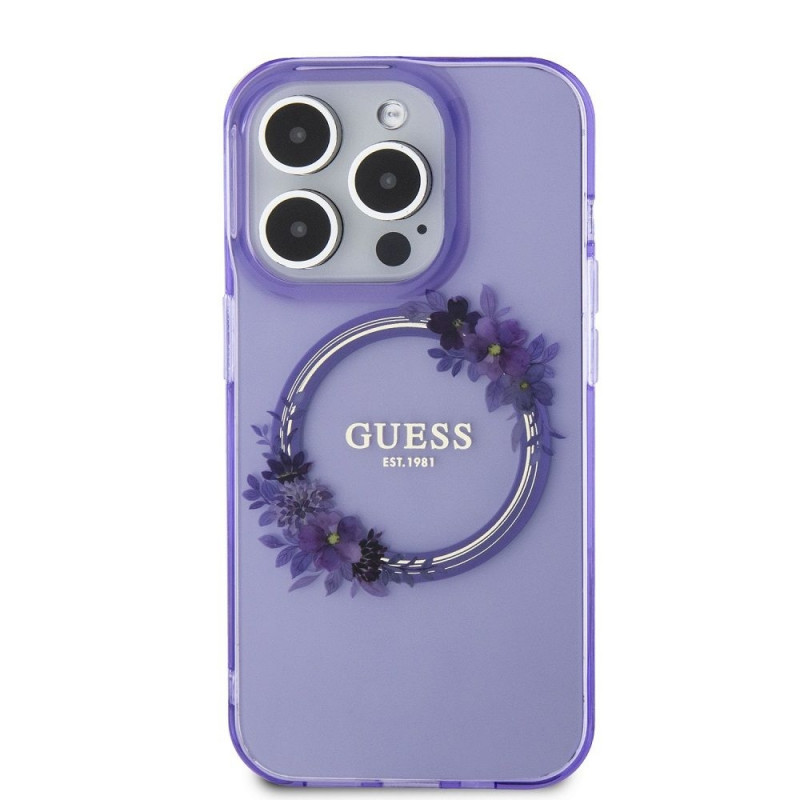 Guess PC|TPU Flowers Ring Glossy Logo MagSafe Kaane iPhone 15 Pro Max lilla