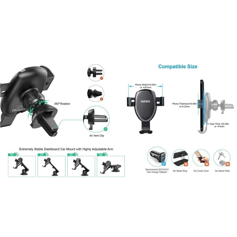 Car Phone Mount CHOETECH, with wireless charging function, 10W