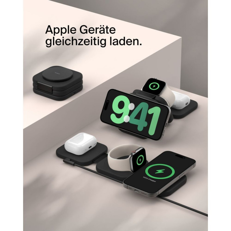 - Lae oma olulisi seadmeid mugava kokkupandava laadijaga, mida on lihtne transportida. Selle laadijaga saad mitte ainult kiiresti juhtmevabalt laadida oma iPhone 16, 15, 14, 13 või 12 kuni 15W võimsusega, vaid ka oma Apple Watchi ja AirPodse kuni 5W võimsusega. Tänu magnetilisele Qi2 tehnoloogiale saad asetada oma iPhone laadimisalusele ja kindlalt laadida seda õiges asendis.