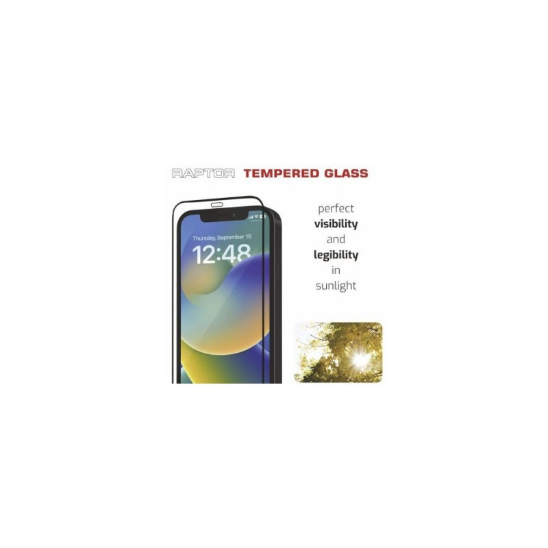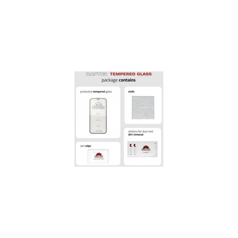 Perfectly clear Swissten Raptor tempered glass from the "Case Friendly" category with tempered, rounded edges, oleophobic antibacterial layer and high durability. Packed in a SWISSTEN blister.