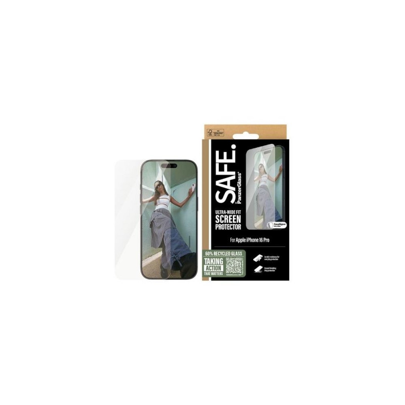 SAFE. is for real. SAFE. is for you. SAFE. is for dance floor mishaps, selfies gone wrong and your everyday fumbling, dropping and screen cracking. This SAFE. by PanzerGlass®️ screen protector made of 60% recycled material acts as a discrete airbag, protecting your phone by absorbing impacts and providing high-level scratch resistance without compromising the functionality and look of your device. It even has a smudge-free coating that reduces traces of fingerprints and grease.<br><br>Can you feel it? Love is in the air. Love for phones and the planet. It’s the new circle of phone life. When you keep your beloved phone SAFE., you can one day pass it on to another phone lover who will love it just as much as you do. Choose SAFE. and give your phone a second, third or fourth life! This is one way of working toward a more sustainable future! Another is to use less and less and LESS packaging: For this screen protector, we’ve reduced the paper packaging by 33%*. This product comes in a recyclable FSC™-certified box.<br><br>Everybody deserves to be SAFE. Without hassle, red tape, or unnecessary complexity. This screen protector comes with an EasyAligner that makes installation a piece of cake (seriously!) and to make it even easier, we’ve included step-by-step instructions as well as a QR code for quick access to our online how-to video. And remember: You just need to install the screen protection once! Then you’ll never again fear the sight of your phone tumbling to the ground screen first. This may not happen, but if it does, you’ll regret not having clicked “add to cart”.<br><br>No screen protection is worth poor screen performance! That’s why this screen protector comes in Ultra-Wide Fit, meaning it covers the front surface of your phone, providing a complete and crystal-clear view of your screen. It even leaves a little room around the edges to give you the freedom to upgrade your protection with a SAFE. by PanzerGlassTM case. And if you want 360-degree protection, combine the screen protector and case with a SAFE. by PanzerGlass® camera lens protector.<br><br><b>Keep your phone SAFE.</b><br><br>*Measured by third-party lab by comparing the mass of the new paper packaging introduced in 2023 with the mass of the previous paper packaging introduced in 2022 (CPRTC, report No. ZSA20231301-0016).PanzerGlass SAFE. by ® Screen Protector iPhone 16 Pro | Ultra-Wide Fit. Brand compatibility: Apple, Compatibility: Apple - iPhone 16 Pro. Dry application. Protection features: Scratch resistant, Shock resistant. Material: Tempered glass, Polyethylene terephthalate (PET), Silicone, Product colour: Transparent. Quantity per pack: 1 pc(s)
