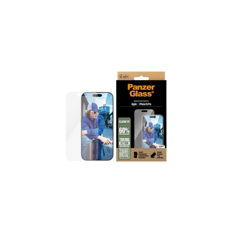 Want to protect your phone screen from the hazards of everyday life? Then this scratch, shock and drop-resistant PanzerGlass® screen protector is your knight in shining armor. It’s made of 60% recycled glass and will shield your phone screen from accidental bumps against sharp-edged dangers and crushing falls onto stone-hard pavements. And to top it all off, it has a smudge-free coating that reduces traces of fingerprints and grease to give you a clear screen view. The enclosed EasyAligner made of 100% recycled plastic makes installation a piece of cake (seriously!). To make it even easier, we’ve included step-by-step instructions as well as a QR code for quick access to our online how-to video. And remember: Once installed, you’ll never again fear your phone falling screen-first. This might not happen, but then again … it might! This screen protection prolongs the lifetime of your phone so that one day you can pass it on to someone else who will love it just as much as you do. It’s the new circle of phone life and one way of working toward a more sustainable future. Another is to use less packaging: In 2024, we reduced the amount of paper in our PanzerGlass® core product packaging design by an average of 66 %*. So, of course, this product comes in a recyclable FSC™-certified box. The screen protector is Classic Fit, meaning it covers the active part of your screen. For extra phone protection, combine the screen protection with a PanzerGlass® protective case, for example, a fearlessly fashionable case from CARE by PanzerGlass®, and a PanzerGlass® PicturePerfect or Hoops® camera lens protector. *Reduction from 2022-2024 measured by comparing selected products from the PanzerGlass® core range.PanzerGlass ® Screen Protector iPhone 16 Pro | Classic Fit. Brand compatibility: Apple, Compatibility: Apple - iPhone 16 Pro. Dry application. Protection features: Scratch resistant, Shock resistant. Material: Tempered glass, Polyethylene terephthalate (PET), Silicone, Product colour: Transparent. Quantity per pack: 1 pc(s)