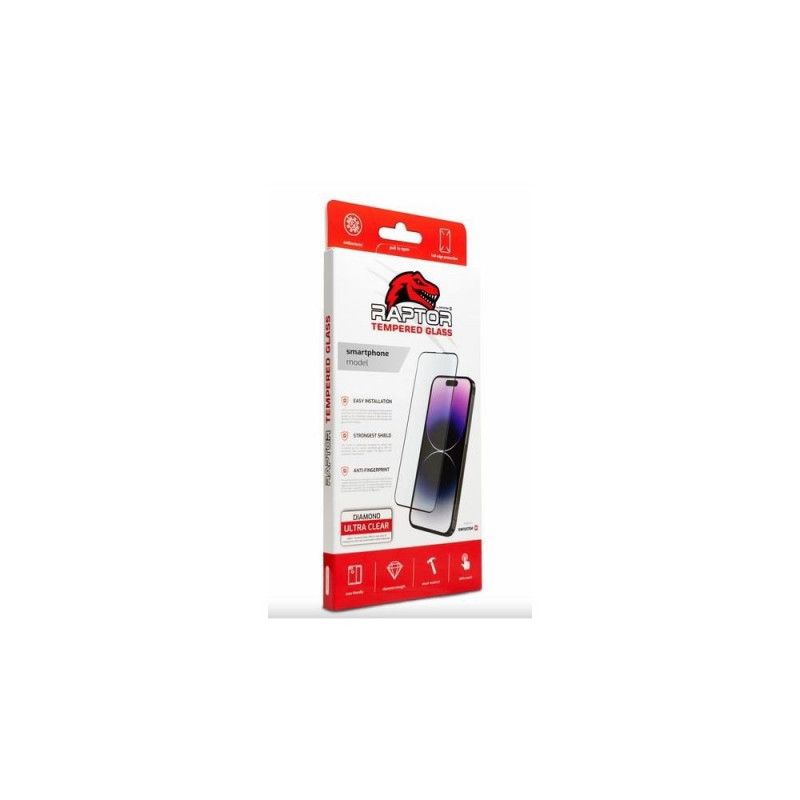 Swissten Raptor perfectly clear tempered glass from the "Case Friendly" category with hardened, rounded edges, oleophobic antibacterial coating and diamond strength. Packaged in a SWISSTEN blister pack.