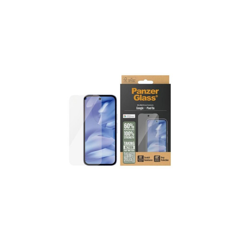 This PanzerGlass® screen protector is made of 60% recycled material and provides higher scratch resistance. It even has an impressive shock-resistance capabilities and high-level drop protection, this PanzerGlass® screen protector keeps your phone screen safe from accidental bumps against sharp-edged dangers, crushing falls onto stone-hard pavements and other hazards of everyday life. It also has a smudge-free coating that reduces traces of fingerprints and grease. <br><br>Can it get any better? To make it even easier, we’ve included step-by-step instructions as well as a QR code for quick access to our online how-to video. And remember: Once the screen protection is applied, you’ll never again fear the sight of your phone tumbling to the ground screen first. This may not happen, but if it does, you’ll regret not having clicked “add to cart”. <br><br>This screen protection prolongs the lifetime of your phone so that one day you can pass it on to someone else who will love it just as much as you do. This is one way of working toward a more sustainable future. Another is to use less packaging: For this screen protector, we have managed to reduce the paper packaging by 33%* compared to previous models. So, of course, this product comes in a recyclable FSC™-certified box. <br><br>The screen protector is Ultra-Wide Fit, which means that it covers the front surface of your phone, providing a complete and crystal-clear view of your screen while still leaving a little room around the edges for a PanzerGlass® case. If you want 360-degree phone protection, combine the screen protector and case with a PanzerGlass® PicturePerfect or Hoops camera lens protector. <br><br>*Measured by third-party lab by comparing the mass of the new paper packaging introduced in 2023 with the mass of the previous paper packaging introduced in 2022 (CPRTC, report No. ZSA20231301-0016).PanzerGlass ® Screen Protector Google Pixel 9a | Ultra-Wide Fit. Brand compatibility: Google, Compatibility: Google - New Pixel 8a 5G. Dry application. Protection features: Scratch resistant, Shock resistant. Material: Tempered glass, Polyethylene terephthalate (PET), Silicone, Product colour: Transparent. Quantity per pack: 1 pc(s)
