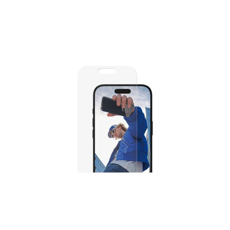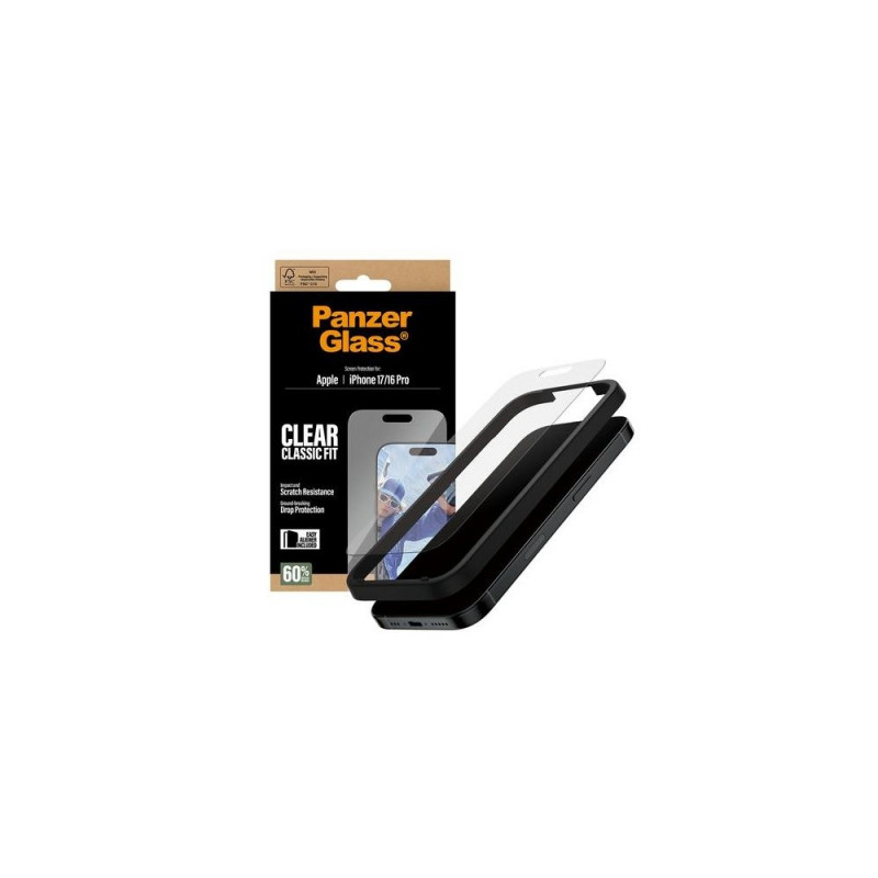Want to protect your phone screen from the hazards of everyday life? Then this scratch, shock and drop-resistant PanzerGlass® screen protector is your knight in shining armor. It’s made of 60% recycled glass and will shield your phone screen from accidental bumps against sharp-edged dangers and crushing falls onto stone-hard pavements. And to top it all off, it has a smudge-free coating that reduces traces of fingerprints and grease to give you a clear screen view. The enclosed EasyAligner made of 100% recycled plastic makes installation a piece of cake (seriously!). To make it even easier, we’ve included step-by-step instructions as well as a QR code for quick access to our online how-to video. And remember: Once installed, you’ll never again fear your phone falling screen-first. This might not happen, but then again … it might! This screen protection prolongs the lifetime of your phone so that one day you can pass it on to someone else who will love it just as much as you do. It’s the new circle of phone life and one way of working toward a more sustainable future. Another is to use less packaging: In 2024, we reduced the amount of paper in our PanzerGlass® core product packaging design by an average of 66 %*. So, of course, this product comes in a recyclable FSC™-certified box. The screen protector is Classic Fit, meaning it covers the active part of your screen. For extra phone protection, combine the screen protection with a PanzerGlass® protective case, for example, a fearlessly fashionable case from CARE by PanzerGlass®, and a PanzerGlass® PicturePerfect or Hoops® camera lens protector. *Reduction from 2022-2024 measured by comparing selected products from the PanzerGlass® core range.PanzerGlass ® Screen Protector iPhone 17 | iPhone 16 Pro | Classic Fit w. EasyAligner. Brand compatibility: Apple, Compatibility: Apple - iPhone 17, Apple - iPhone 16 Pro. Dry application. Protection features: Scratch resistant, Shock resistant. Material: Tempered glass, Polyethylene terephthalate (PET), Silicone, Product colour: Transparent. Quantity per pack: 1 pc(s)