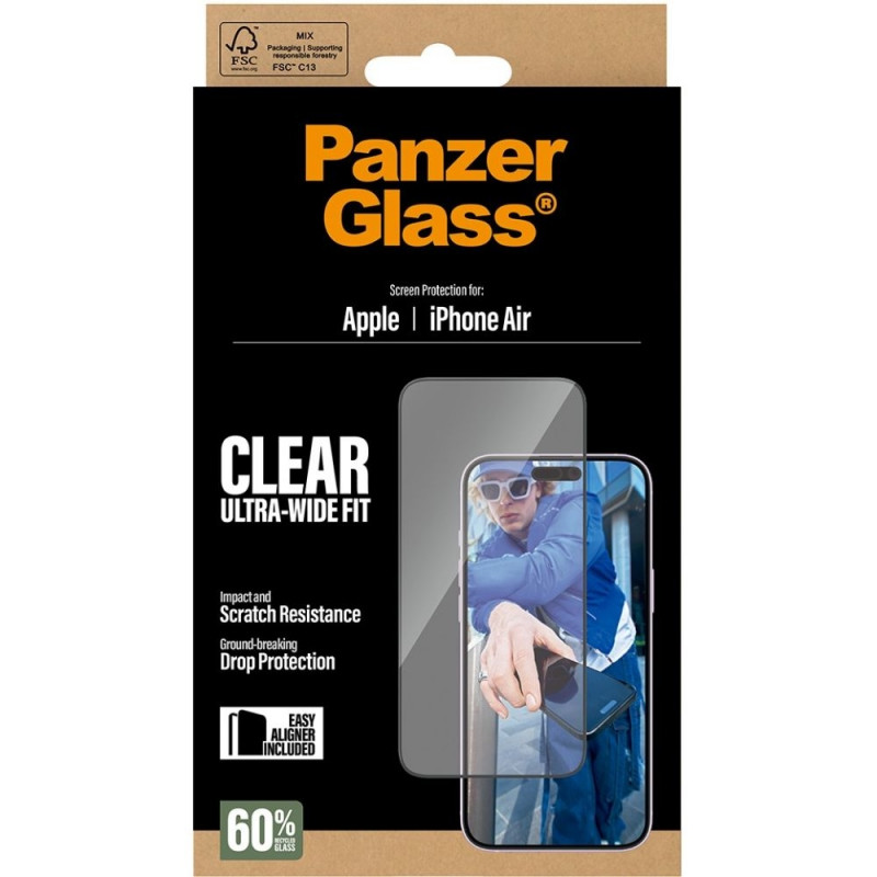 PanzerGlass® ekraanikaitse iPhone Air | Ultra-Wide Fit koos EasyAligneriga. Brändi sobivus: Apple, sobivus: Apple – iPhone Air. Kuiv paigaldus. Kaitsefunktsioon: kriimustuskindel, põrutuskindel. Materjal: karastatud klaas, polüetüleentereftalaat, silikoon. Toote värvus: läbipaistev. Kogus pakis: 1 tükk.