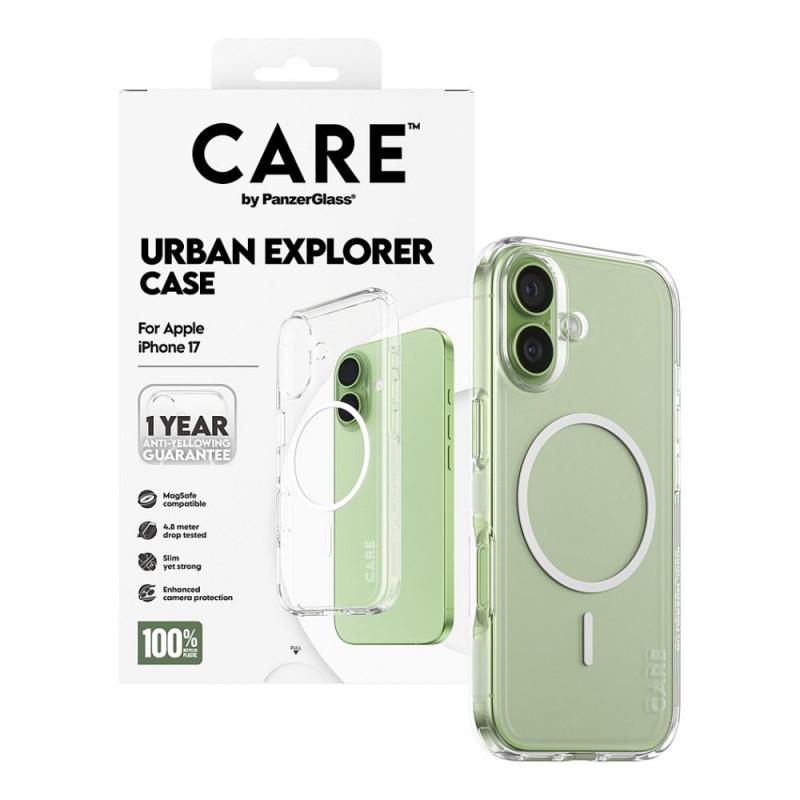 PanzerGlass CARE™ by ® Urban Explorer ümbris Transparent valge MagSafe iPhone 17-le. Ümbrise tüüp: Kate, brändi ühilduvus: Apple, ühilduvus: Apple – iPhone 17, pinnaviimistlus: Ühevärviline, toote värvus: Läbipaistev