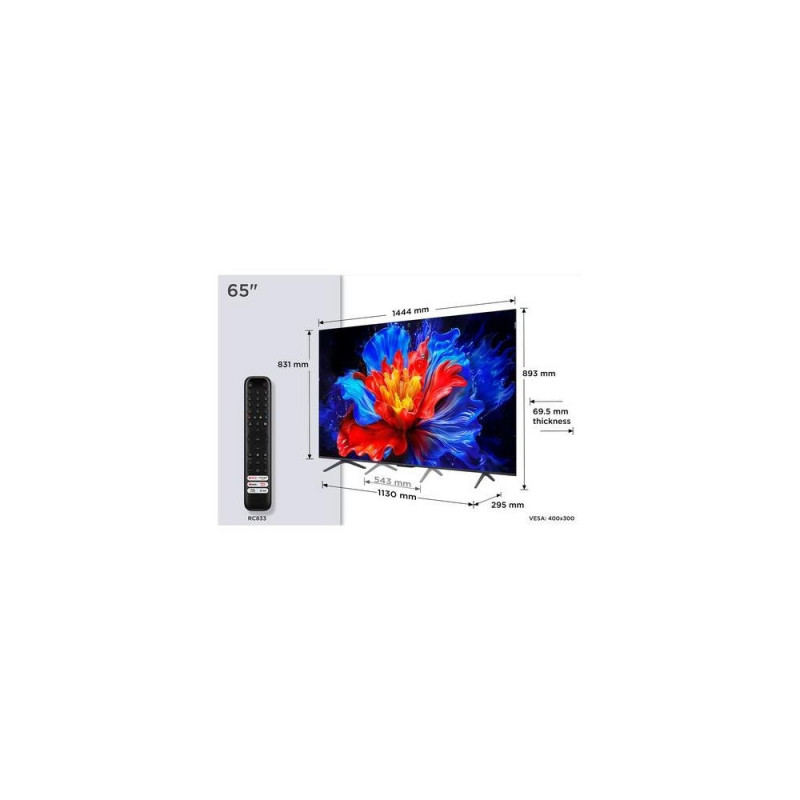<br />TCL P8K 65P8K 65" 4K QLED HDR Smart TV. Display diagonal: 165.1 cm (65"), Display resolution: 3840 x 2160 pixels, HD type: 4K Ultra HD, Display technology: QLED, Screen shape: Flat, LED backlighting type: Direct-LED. Smart TV. Motion interpolation technology: PPI (Picture Performance Index) 3700, Display brightness: 350 cd/m², Response time: 6.5 ms, Native aspect ratio: 16:9. Digital signal format system: DVB-C, DVB-S2, DVB-T2. Wi-Fi, Ethernet LAN. Product colour: Metallic