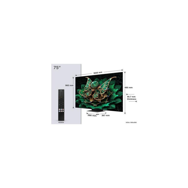 <br />TCL 75C7K. Display diagonal: 190.5 cm (75"), Display resolution: 3840 x 2160 pixels, HD type: 4K Ultra HD, Display technology: QD-Mini LED, Screen shape: Flat. Smart TV. Motion interpolation technology: PPI (Picture Performance Index) 4600, Display brightness: 3000 cd/m², Native aspect ratio: 16:9. Digital signal format system: DVB-C, DVB-S2, DVB-T2. Wi-Fi, Ethernet LAN. Product colour: Metallic