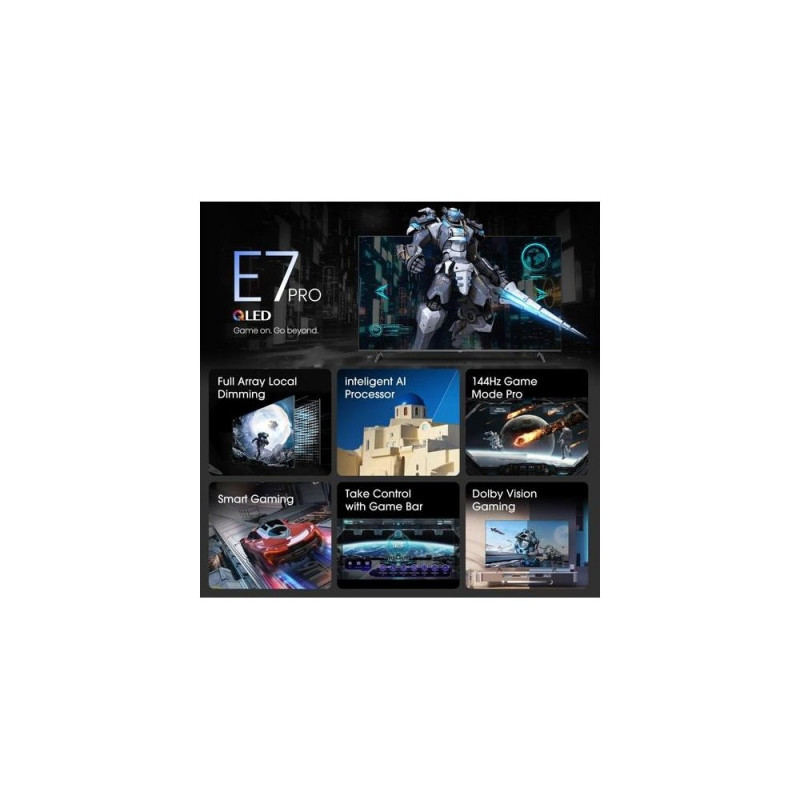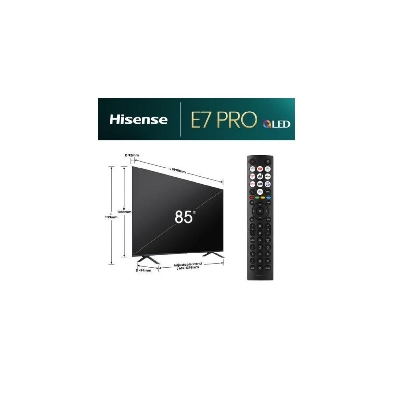 <br />Hisense 85E77NQ PRO. Display diagonal: 2.16 m (85"), Display resolution: 3840 x 2160 pixels, HD type: 4K Ultra HD, Display technology: QLED, Screen shape: Flat, LED backlighting type: Direct-LED. Smart TV. Display brightness: 450 cd/m², Response time: 6 ms, Contrast ratio (typical): 6000:1, Native aspect ratio: 16:9. Digital signal format system: DVB-C, DVB-S, DVB-S2, DVB-T, DVB-T2. Wi-Fi, Ethernet LAN. Product colour: Grey