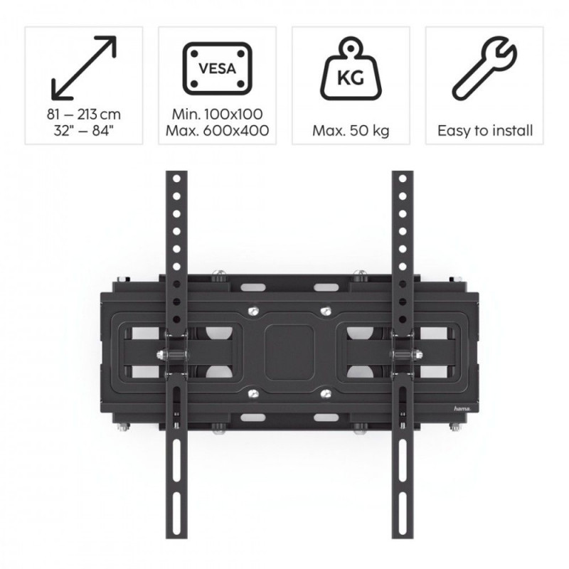 Hama teleri seinakinnitus sobib ekraanidele suurusega 32" kuni 84" (81–213 cm) ning toetab VESA kinnitusstandardeid vahemikus 100 x 100 kuni 600 x 400. Kinnitus kannab kuni 50 kg kaaluvaid telereid.