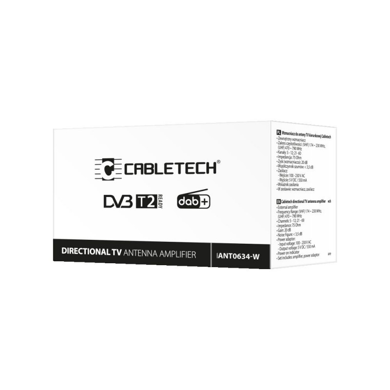 Soovid parandada telepildisignaali vastuvõtu kvaliteeti? Cabletechi suunatud TV-antennile mõeldud võimendi ja toiteplokk tagavad selge DVB-T, DVB-T2 ja DAB+ signaali vastuvõtu, pakkudes 20 dB võimendust ja minimaalset müra. Seade toetab VHF- ja UHF-sagedusvahemikke, tagades usaldusväärse pildi- ja helikvaliteedi. Lihtne paigaldus ja toiteindikaator võimaldavad täielikku kontrolli seadme kasutamise üle.