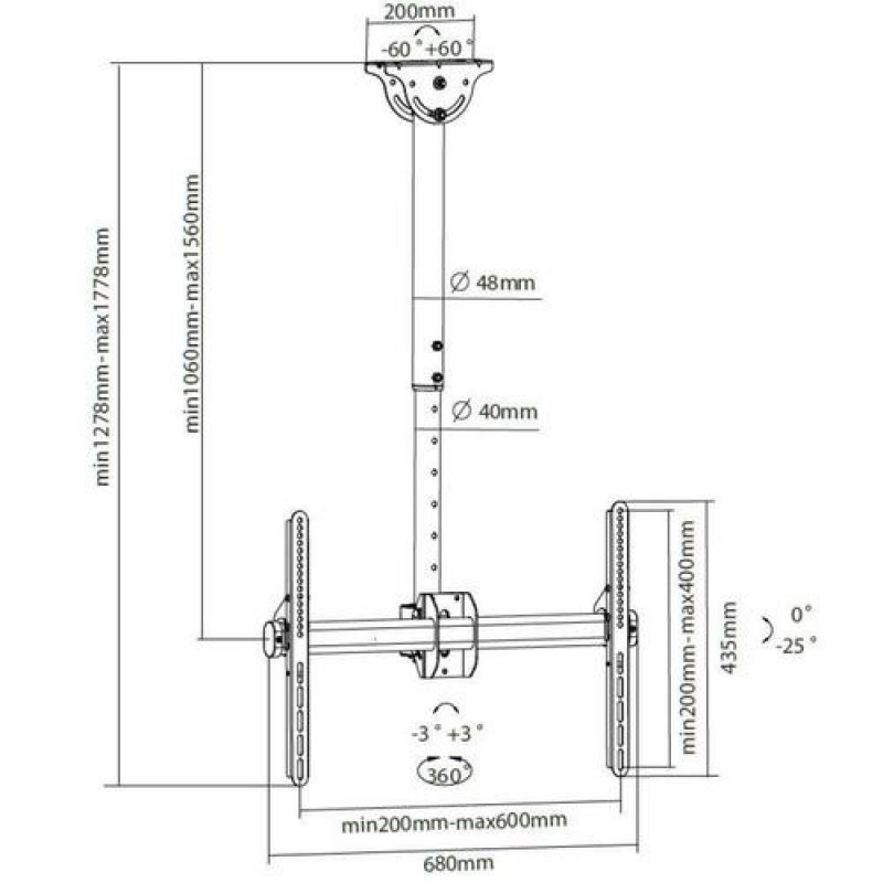 - ICA CPLB-946L is a telescopic bracket ceiling full-motion designed to offer the ultimate in versatility and universal compatibility<br>- Tilting plate for ceiling applications and sloping floor<br>- It allows screens to be tilted down or rotated without tools<br>- Includes VESA plate for any LCD TV 37 "- 70" or monitors up to 50 kg<br>- Adjustable height for perfect TV placement<br>- A flume cable management keeps cables concealed and organized<br>- Maximum length of the arm: 1778 mmTechly 37-70 Telescopic Ceiling Long Support LED TV LCD" ICA-CPLB 946L. Maximum weight capacity: 50 kg, Minimum screen size: 94 cm (37"), Maximum screen size: 177.8 cm (70"), Minimum VESA mount: 200 x 200 mm, Maximum VESA mount: 600 x 400 mm. Height adjustment range: 1060 - 1560 mm, Tilt angle range: -25 - 0°, Swivel angle: 180°. Product colour: Black
