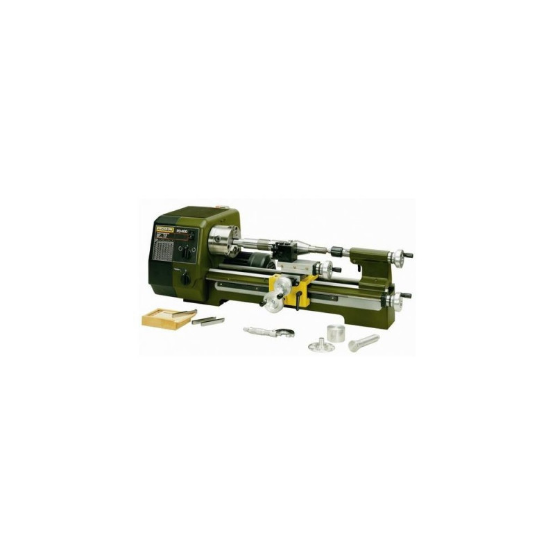 <b>The Lathe PD 400 is the heart of a multifunctional and expandable system and is unequalled in its class!</b><br>Ideal for straight and cross cuts, taper turning, internal and external thread cutting, slotting, etc. Useable on materials such as steel, nonferrous metals, aluminium and alloys. Negligible tolerances even under heavy loads. The wide range of accessories complements the lathe’s functions. The bed is already equipped with a milled and tapped surface for securing mill/drill PF 400.<br><br><b>Technical data:</b><br>Distance between centres 400mm and cross slide travel 85mm, over the top slide is 116mm. Solid, ribbed bed is made from quality cast iron with ground and hardened ways. Oversized spindle with 2 adjustable taper bearings, MK3 taper and 20.5mm bore. Run-out, without chuck, 5/1,000mm.<br>Includes the precision 3 jaw chuck, 100mm diameter. Six spindle speeds are provided via belt drive: stage 1: 80 - 330 - 1,400rpm and stage 2: 160 - 660 - 2,800rpm. Powerful, quiet motor with 550W power output. Practical handwheels with zero adjustable graduated collar (2 parts). For cross slide and upper carriage: 1 division = 0.025mm. 1 rev. = 1.0mm. For tailstock and leading spindle: 1 division = 0.05mm. 1 rev. = 1.5mm. The activatable auto feed has speeds of 0.07 or 0.14mm/rev.<br>An integrated gearbox, for LH and RH threads, with change gears provides 19 metric pitches: 0.2 - 0.25 - 0.3 - 0.35 - 0.4 - 0.45 - 0.5 - 0.6 - 0.7 - 0.75 - 0.8 - 0.9 -1.0 - 1.25 - 1.5 - 1.75 - 2.0 - 2.5 -3.0mm. Imperial threads of 10 - 48 TPI are also possible. A rotating centre MK 2 and tailstock chuck of 10mm capacity, B12 taper, are included. Lead screw with acme thread 12 x 1.5, top slide 52mm and adjustable to turn tapers, with graduations up to 45°. Tailstock with MK 2. 24mm diameter and 40mm travel (with graduations).<br>Overall size approx. 900 x 400 x 300mm (L x W x H). Weight approx. 45kg. Uses cutting tools 10 x 10mm.<br>A tool holder with two adjustable inserts is included as standard.Proxxon PD 400. Width: 400 mm, Depth: 900 mm, Height: 300 mm