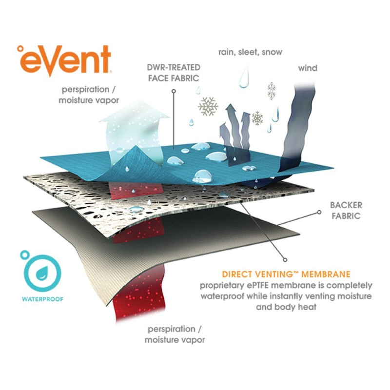 eVent tehnoloogia, mida kasutatakse kangas. Tänu sellele on tagatud jalgade maksimaalne hingavus, hoides samal ajal väljast poolt tungivat niiskust eemal. Lisa veekindluse