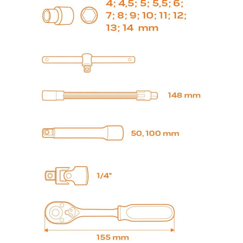 "1/4-tollised padrunvõtmed, komplekt 19 tk, sisetükk"