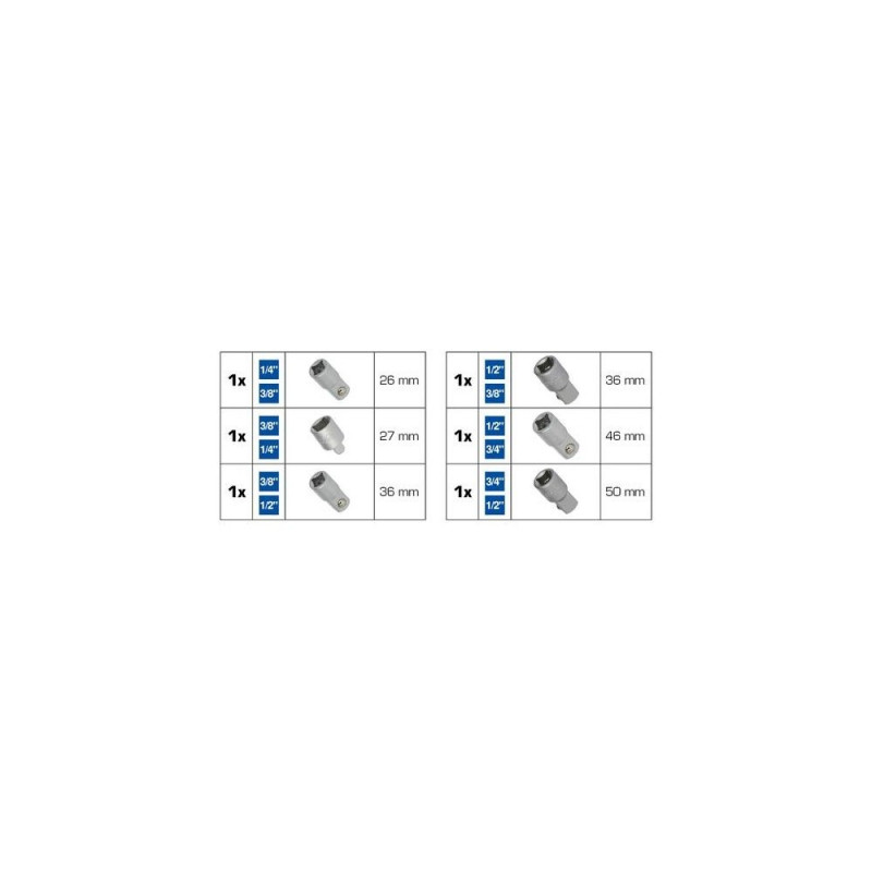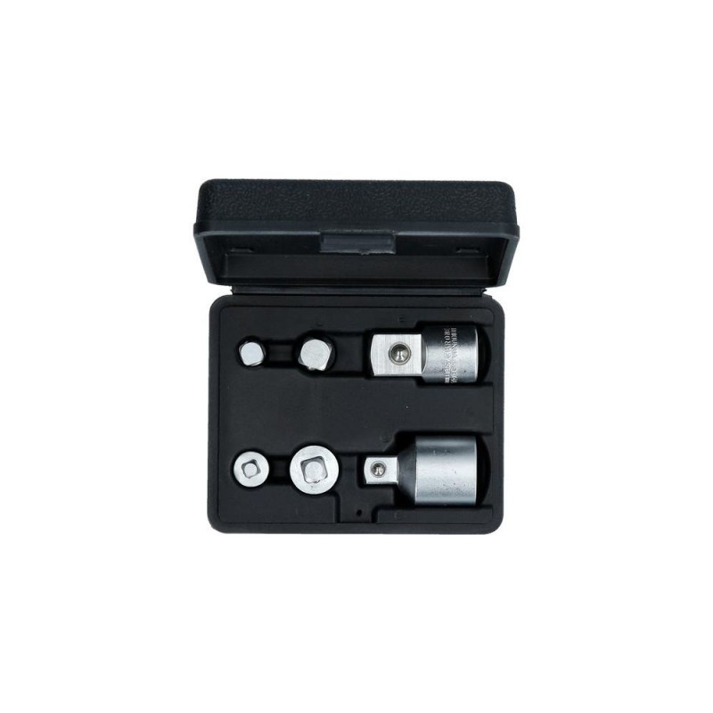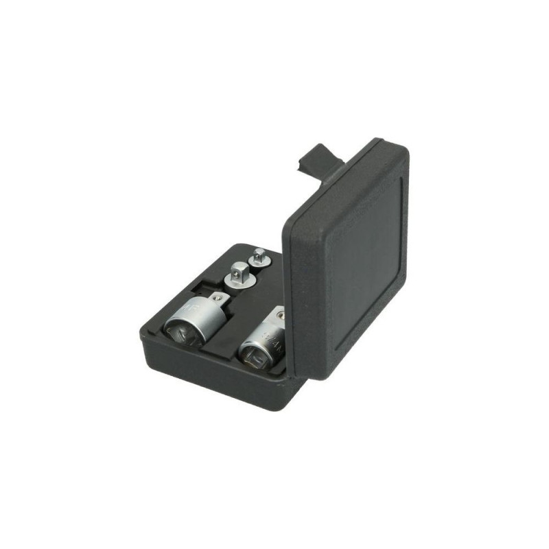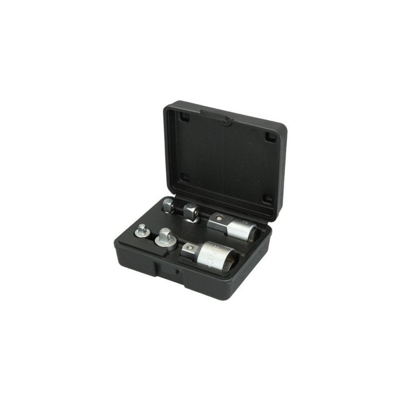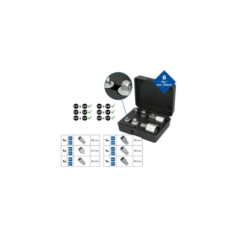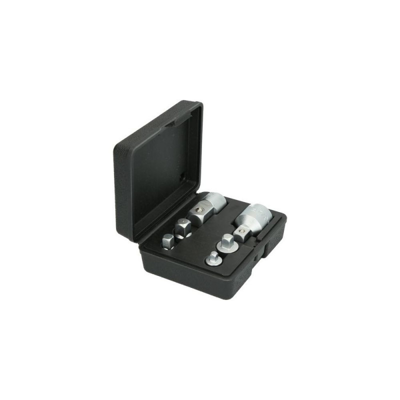 6-piece adapter set 1/4” (6.3 mm), 3/8” (10 mm), 1/2” (12.5 mm)<br>All tools are perfectly stowed, no rattling<br>Labels inside the case increase overview<br>each manufactured according to DIN<br>Made of high-quality chrome vaOsta kohe, viimased eksemplarid laos!