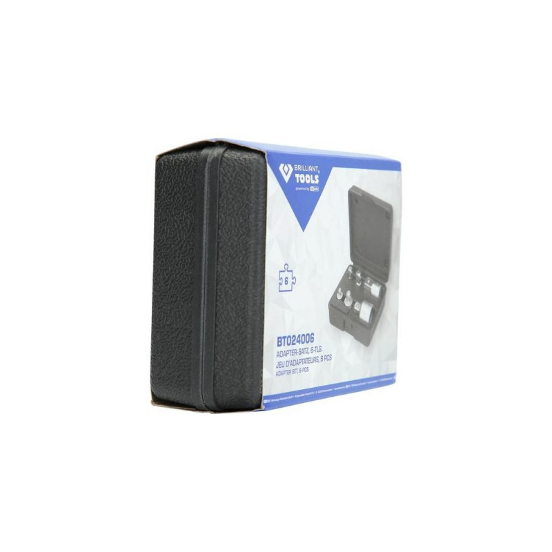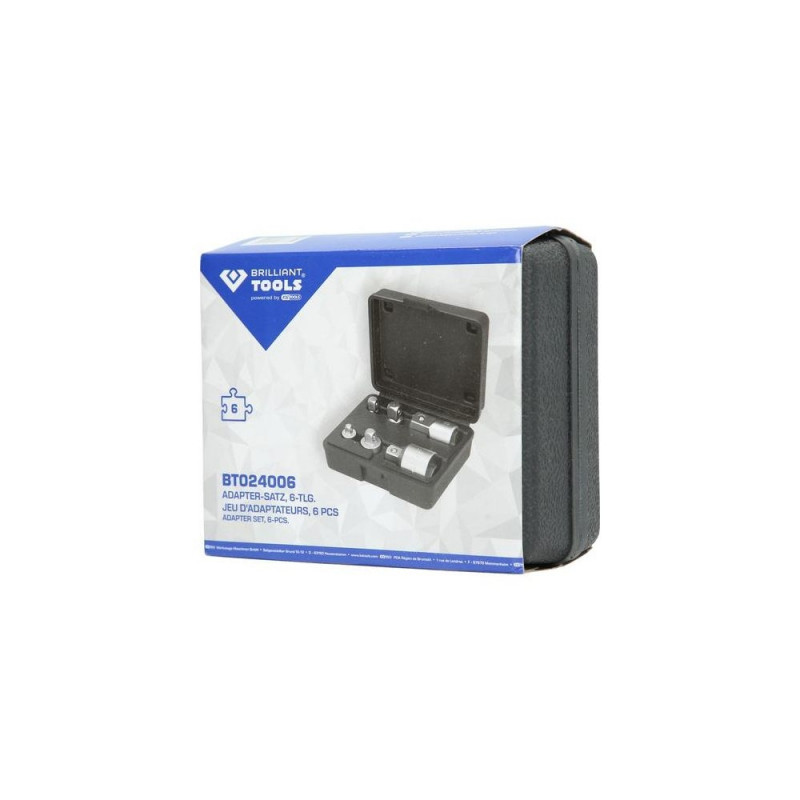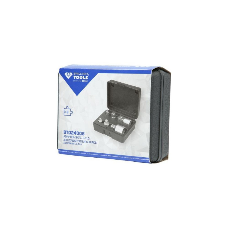 6-piece adapter set 1/4” (6.3 mm), 3/8” (10 mm), 1/2” (12.5 mm)<br>All tools are perfectly stowed, no rattling<br>Labels inside the case increase overview<br>each manufactured according to DIN<br>Made of high-quality chrome vanadium steel for particularly long service life<br>Matt chrome<br>The BRILLIANT TOOLS adapter set BT024006 is suitable for professionals and hobbyists. The set includes a practical square drive-adaptor set in a variety of sizes. The tool is also made from high-quality chrome vanadium steel, making it exceptionally sturdy. The surface is plated with matt chrome and fits comfortably in the hand.<br>Contents:<br>Adapter square 6.3 mm (1/4”) - external square 10 mm (3/8”), max. force 60 Nm<br>Adapter square 10 mm (3/8”) - external square 6.3 mm (1/4”), max. force 60 Nm<br>Adapter square 10 mm (3/8”) - external square 12.5 mm (1/2”), max. force 200 Nm<br>Adapter square 12.5 mm (1/2”) - external square 10 mm (3/8”), max. force 200 Nm<br>Adapter square 12.5 mm (1/2”) - external square 20 mm (3/4”), max. force 500 Nm<br>Adapter square 20 mm (3/4”) - external square 12.5 mm (1/2”), max. force 500 NmBrilliant Tools BT024006. Quantity per pack: 6 pc(s)