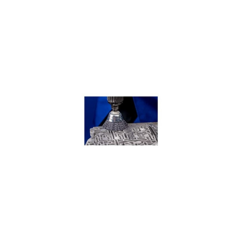 Universally suitable for cleaning, derusting and smoothing, as well as removal of corrosion and paint. Particularly suitable for brushing on large, flat and easily accessible surfaces due to face-down use with the entire brush face applied to the workpiece.<br>Materials that can be worked:<br>Aluminium<br>Other non-ferrous metals<br>High-temperature-resistant materials<br>Cobalt-based alloys<br>Hard non-ferrous metal<br>Bronze<br>Stainless steel (INOX)<br>Cast iron<br>Wood<br>Duroplastics<br>Thermoplastics<br>Steel, cast steel<br>Applications:<br>Roughening<br>Deburring<br>Cleaning<br>Structuring (matt finishing, brush matting and satin finishing)<br>Drive types:<br>Flexible shaft drive<br>Power drill<br>Straight grinderPFERD 43703003. Rotational speed (max): 10500 RPM