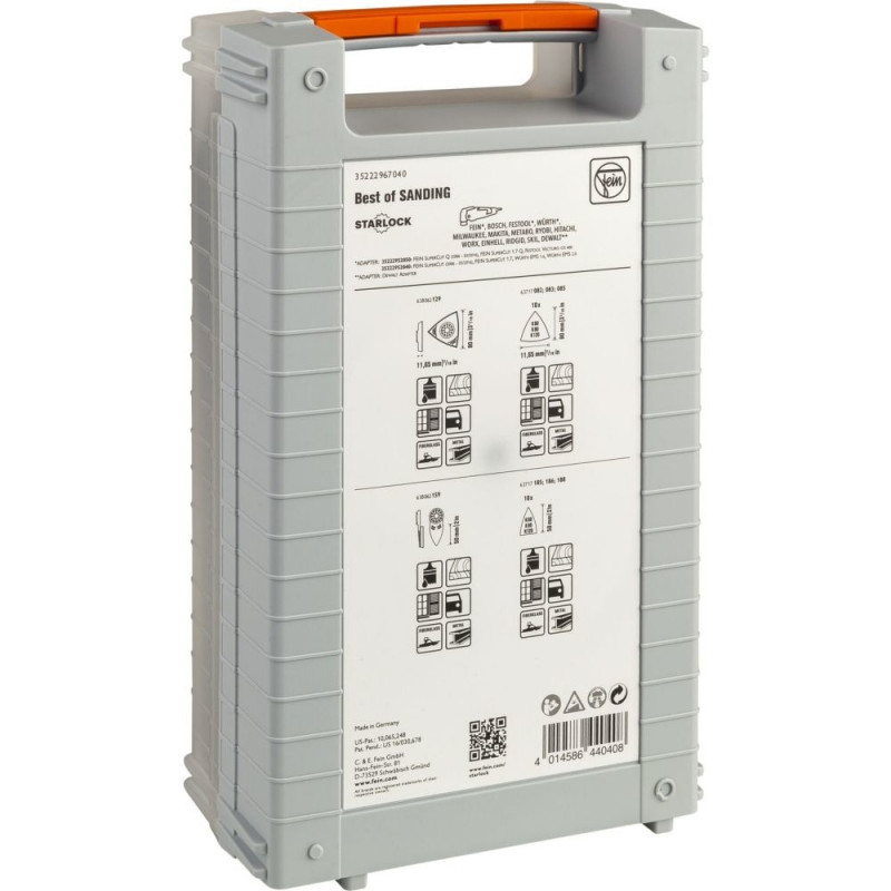 <b>BEST OF STARLOCK SANDING</b>Accessory kit containing 63 parts for sanding in corners and on edges. Suitable for all FEIN MultiTools and all other common MultiTools with Starlock mounting. Available as a set, offering significant savings over purchasing the items individually. Content: 2 sanding pads, unperforated (80 mm), 1 sanding finger, sanding sheets (10 each of grit 60, 80, 120) for sanding pad and sanding finger.FEIN 35222967040. Type: Sander head, Compatibility: Fein MULTIMASTER AMM 500 Plus Select, MULTIMASTER AMM 700 Max Top, MULTIMASTER AMM 700 Max Select,.... Quantity per pack: 63 pc(s)