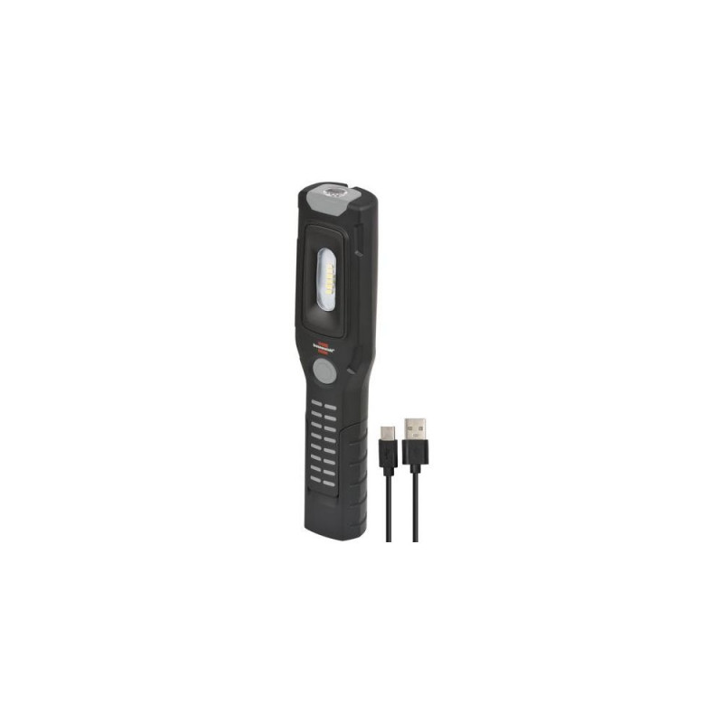 The handy but extremely robust LED hand light can be used anywhere. It is perfect for flexible use thanks to integrated magnets, two 360° rotatable hooks and an articulated base. Thanks to the switching levels (spot-100%-50%) of the super-bright SMD LEDs, the LED workshop lamp shines for up to 10 hours. The inspection light is charged via the USB C interface and using the USB A to USB C charging cable supplied.Brennenstuhl 1175670110. Type: Handheld work light, Product colour: Black, Housing material: Plastic. Bulb technology: LED, Luminous flux: 500 lm, Colour temperature: 6500 K. Power source: Battery, Battery type: Built-in battery, Battery capacity: 2500 mAh. Width: 62 mm, Depth: 42 mm, Height: 273 mm. Cables included: USB Type-C