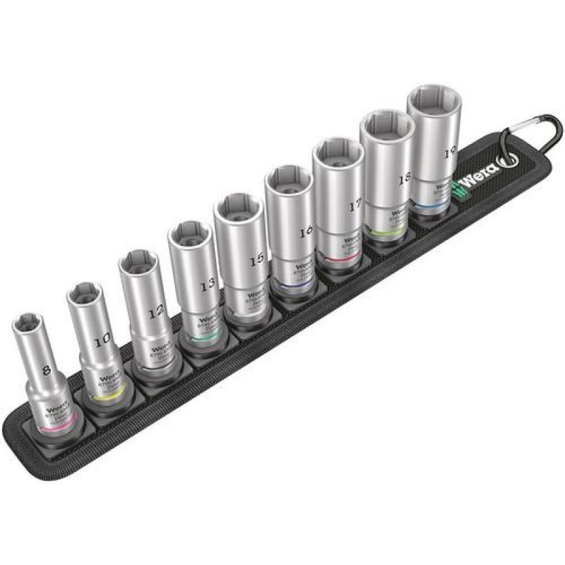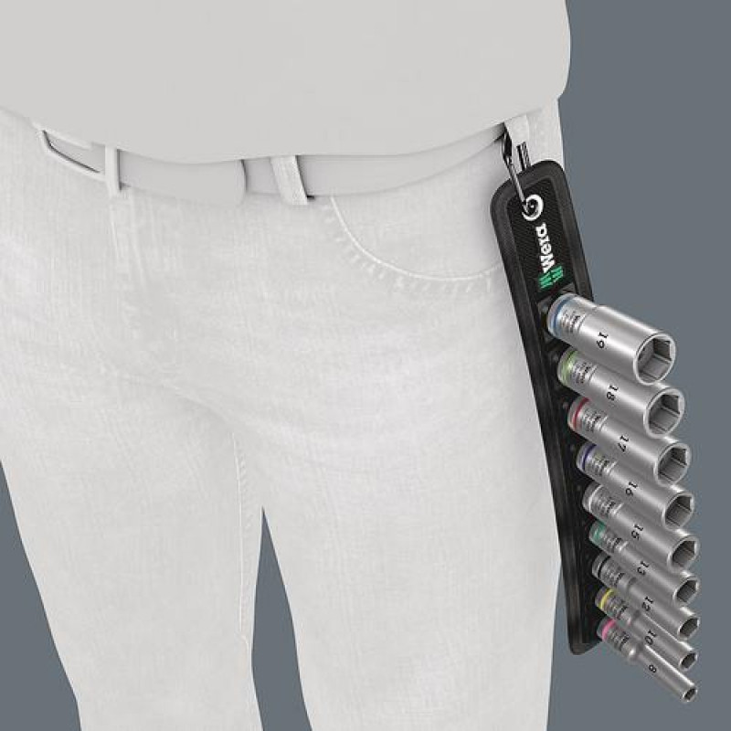Robust textile belt in the typical Wera design with 9 long 1/4“manual and machine socket inserts (non-impacting) in a confined space. A smoother turning mechanism ensures a secure holding and easy removal of sockets. Includes snap hook for attaching to belt loops or bags. With fleece backing and hook and loop fastener strips for easy attachment e.g. on wall, shelf, workshop trolley or the Wera 2go tool transport system. Long 1/4“ manual and mechanical socket wrench inserts (ISO 2725 part 3) from Wera for use in manual and machine operation (non-impacting) even with low-lying screwdriving and protruding threaded rods. With “Take it easy" tool finder with colour coding by size - for easy and fast location of the required tool. Easy to grasp even with oily hands. With hexagonal profile and ball-catching groove. The hexagon profile allows the transmission of high forces and puts less strain on the edges of bolts or screw heads than a double hexagon profile. Fine-toothed ratchets also make the use of a double hexagon profile superfluous, even in confined spaces, thanks to their small back-pivoting angle. For external hexagonal bolts and sockets.Wera 05004545001. Product type: Socket set, Drive size: 3/8", Socket size type: Metric. Width: 320 mm, Weight: 1.02 kg