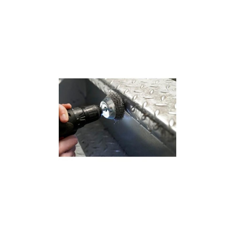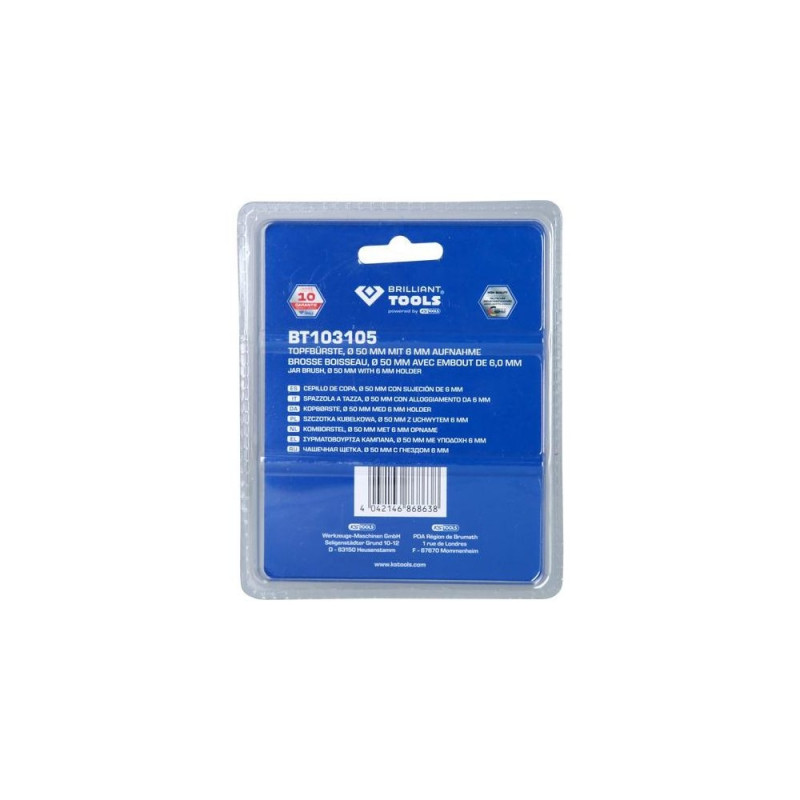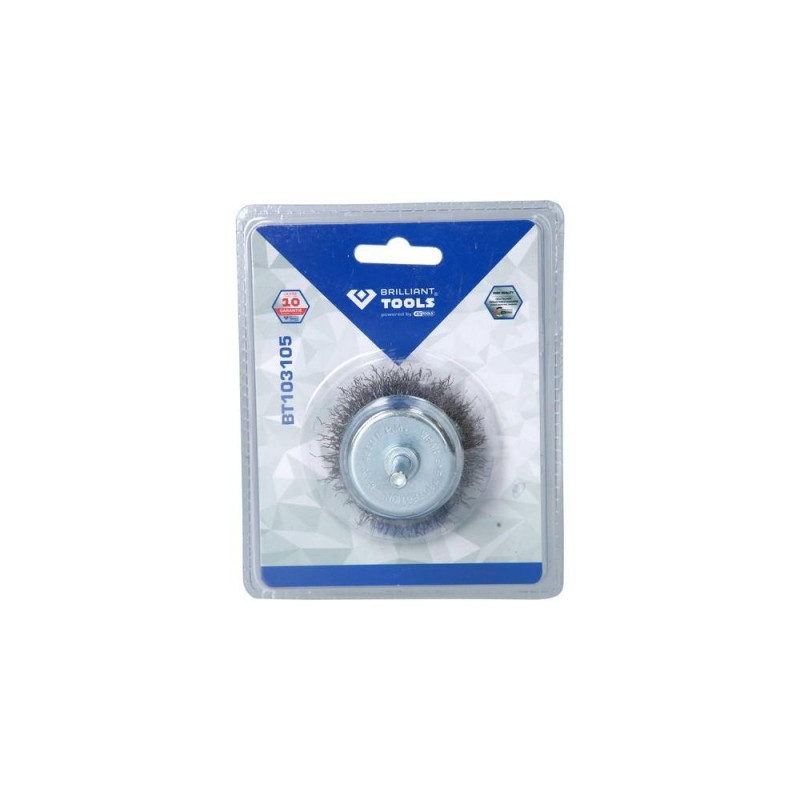 Hardened steel wire<br>Ideal for removing rust, cleaning and stripping paint<br>For hard-to-reach places<br>Ø 50 mm<br>With 6 mm shank<br>Max. 4,500 rpm<br>The BRILLIANT TOOLS jar brush BT103105 is ideal for removing rust, cleaning and stripping paint. The jar brush with hardened steel wire is particularly suitable for hard-to-reach places or large surfaces. It has a diameter of 50 mm and is designed for a maximum of 4,500 rpm. Due to the 6 mm shank, it can be used with a conventional drill or cordless drill.Brilliant Tools BT103105. Quantity per pack: 1 pc(s)