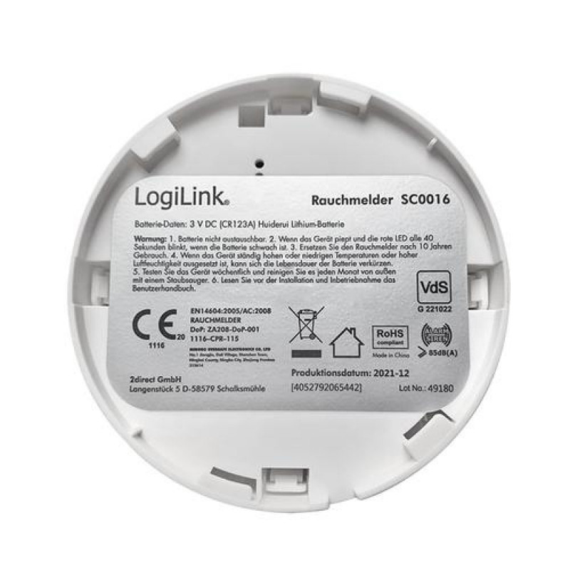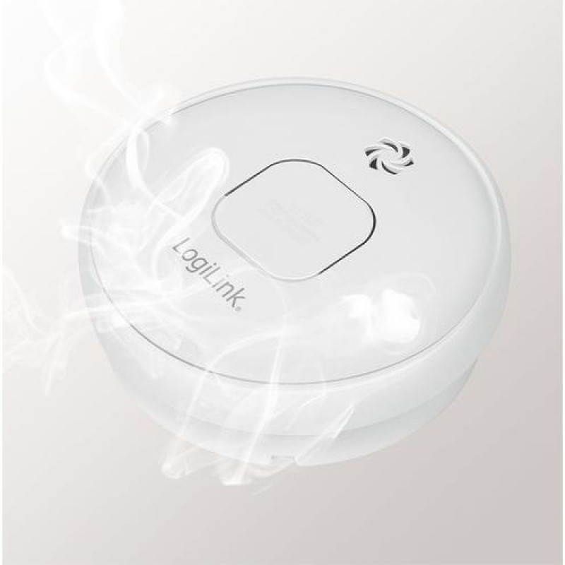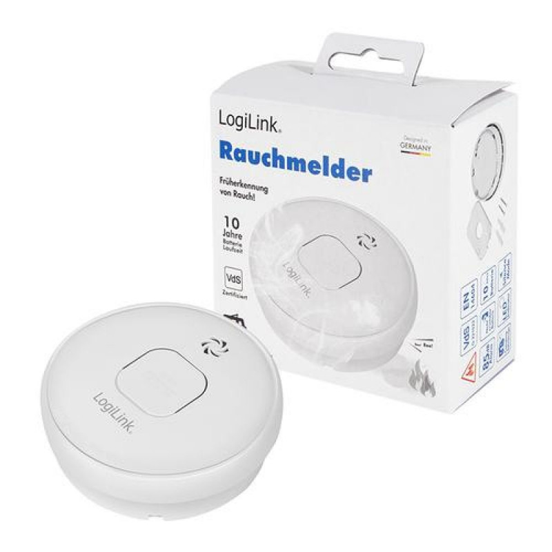 Make your life safer – This smoke detector with 3 V lithium battery has photoelectric sensor which is optimized to detect even slow smoldering fires. Alarm also features a loud 85 dB alarm, easy mounting bracket, a single test/silence button, and an end-of-life signal so you know when to replace the battery. For maximum protection and the ultimate in assurance, you can depend on Logilink's smoke detector to secure what matters most in life.LogiLink SC0016. Detector type: Photoelectrical reflection detector, Connectivity technology: Wireless, Product colour: White. Power source: DC, Battery voltage: 3 V, Battery technology: Lithium. Certification: CE, VdS. Diameter: 10 cm, Height: 33.6 mm, Weight: 91 g. Package width: 104 mm, Package depth: 50 mm, Package height: 104 mm