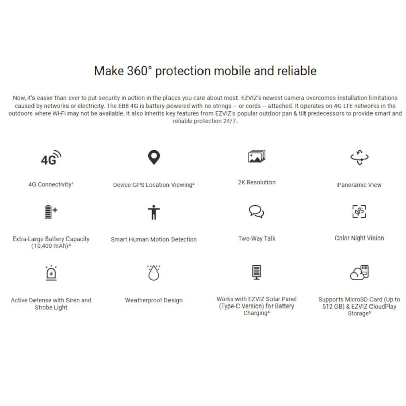 EZVIZ EB8 4G 3MP 2K Väliste Nutika AI Pan & Tilt 360° Akukaamera – Valge Võrratu 4G Ühenduvus, 360° Nutikas AI Jältaja & Päikeseenergia Ühilduvus