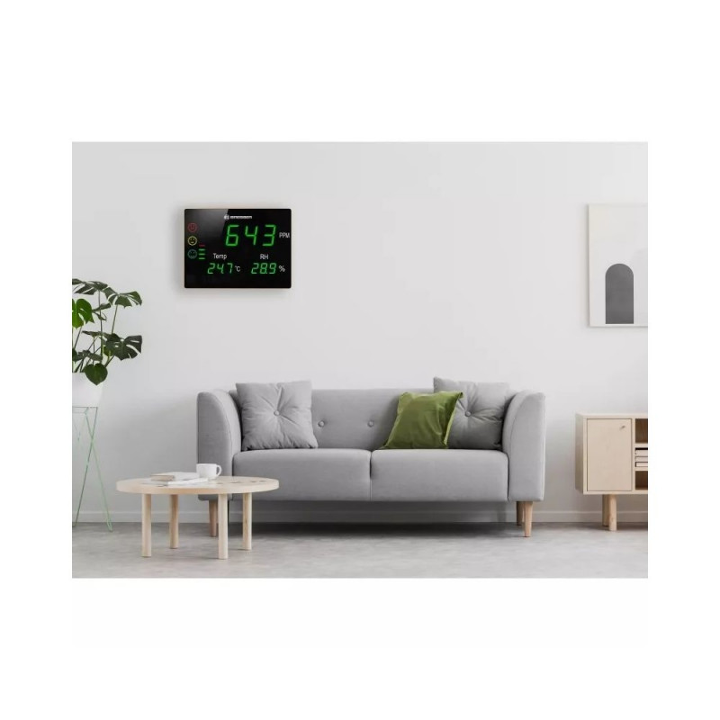 Most people associate CO2 with one thing— it’s harmful effect to the environment. But it’s not just our environment that suffers as a result of carbon dioxide. We too need clean air for our well-being and health. In locations with high concentrations of people, this can lead to problems. The BRESSER CO2 air quality monitor Smile XXL supports you in preventing critical CO2, temperature and humidity values. It couldn’t be easier—all it takes is a quick glance at the extra-large LED display. The graphical display, with three different smiley faces and a bar scale, gives you an initial indication of the current CO2 load. The precise measured value is displayed in large figures below. The device also displays temperature and humidity, so that you have a complete picture of the air conditions at any time. The device impresses with a high resolution and rapid response time for highly accurate results.