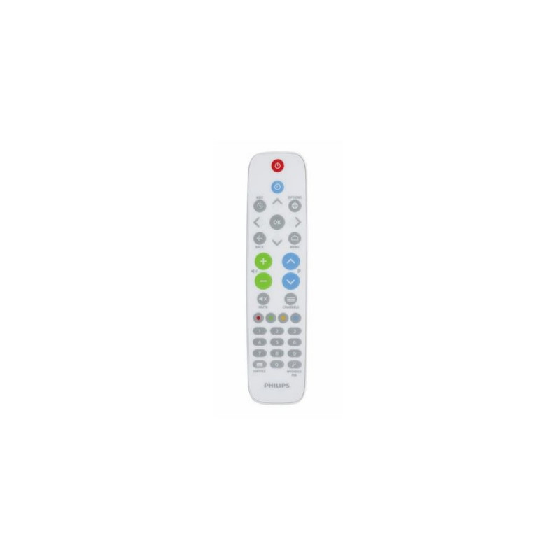 <b>Healthcare remote control </b><br><br>Hygienic and easy to clean<br>Designed for use in healthcare environments, this Philips Professional Remote Control features a simple, color-coded button layout on an easy-clean surface.<br><br><b>Top surface can be cleaned</b><br><br>The top surface of this Philips Professional Remote Control is flat, making it easy to clean with alcohol. The flat surface is also hygienic: no raised buttons means no crevices for germs to get into.<br><br><b>White design for healthcare</b><br><br>The white design and rounded edges give this remote a clean, friendly appearance-perfect for use in healthcare environments. Essential buttons are color-coded and conveniently placed, ensuring ease of operation.<br><br><b>Lockable battery compartment.</b><br><br>The lockable battery compartment is secured with a screw, ensuring batteries can only be removed or changed by staff.<br><br><b>Low-battery detection</b><br><br>The lockable battWhen the battery in your Philips Professional Remote Control runs low, a notification appears on the TV screen. Allowing you to change the batteries before service is affected.ery compartment is secured with a screw, ensuring bPhilips 22AV1604B. Brand compatibility: Philips, Remote control proper use: TV, Input type: Press buttons