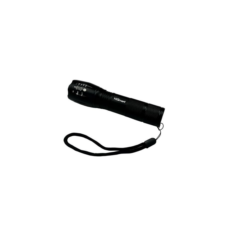 Zoomable flashlight, 1000lm, 5x zoom Comes with a USB charger 5V/2A for rechargeable batteries and a black carrying case.