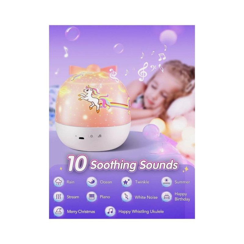 10 WHITE NOISES/LULLABIES TO HELP KID & BABY SLEEP:The kids night light projector light can play BUILT-IN 10 soothing sounds(white noise, rain, etc).Sound qulity of this baby night light kids is HIFI great. When babies lie in bed,watching starry sky with soothing music of unicorn night light baby, they fall asleep soon! With this night light kids & baby night light projector, moms don't worry about kids sleeping alone anymore! This baby night light projector is kids' best sleeping companion!