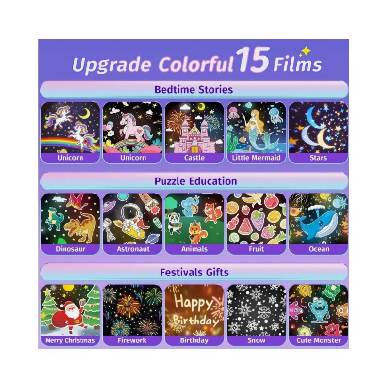 NIGHT LIGHT KIDS WITH 15 FILMS & 105 LIGHTING MODES:The night light kids & baby night light projector has 15 flims which can project stars,moon,unicorn,ocean.The baby night light projector has 7 pretty colors/mix.The star lights projector & baby night light projector makes bedroom like a dream.The baby night light kids covers bedroom with pretty projections,with white noises played by the girls night light projector,the night light kids & unicorn night light baby helps kids/babies sleep soon!